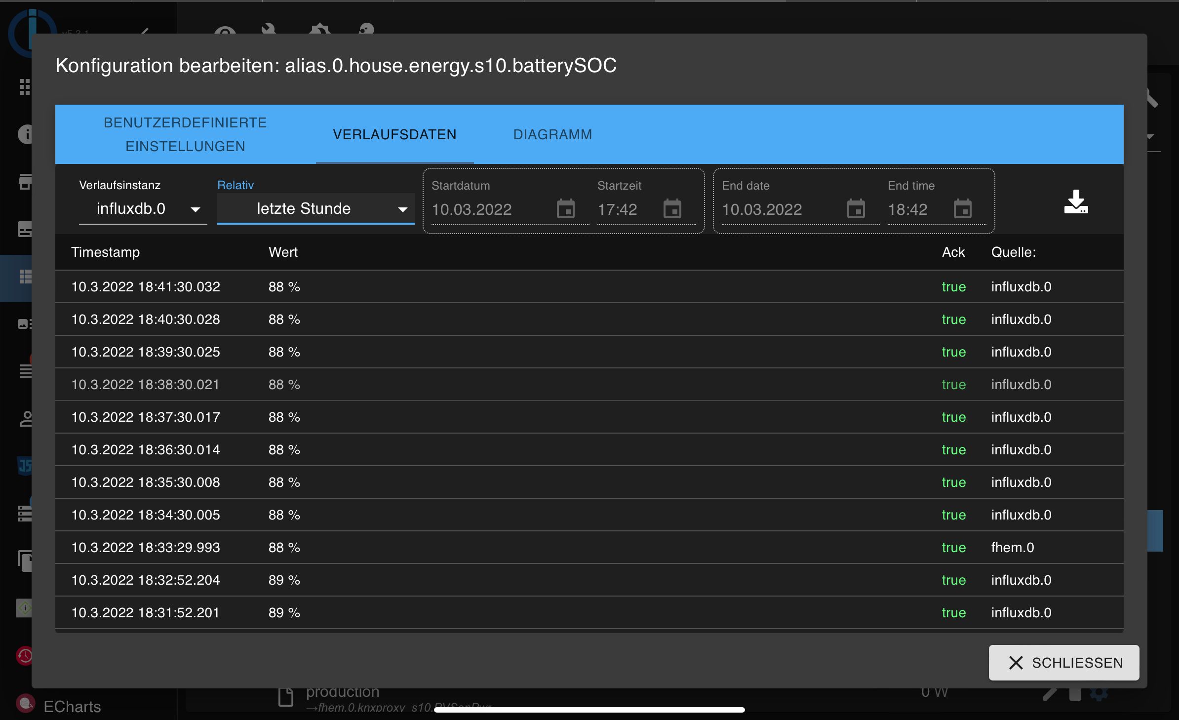 Noch ein Nachtrag zu meiner letzten Mail. Ich habe für meinen in den Abbildungen gezeigten Datenpunkt mal das history-Logging wieder aktiviert (mit gleichen Parametern), womit jetzt also parallel auf influxdb und history geschrieben wird. Auf die generierte Grafik hat das keine Auswirkung - hier kann ich zwischen beiden Datenquellen wechseln, ohne die Anzeige nennenswert zu verändern. Bei den Rohdaten sieht es aber völlig anders aus. Wo mir history alle Daten der letzten 24 Stunden zeigt, liefert influxdb bei einer Auswahl "letzten 24 Stunden" nur Daten die 21 Stunden in der Vergangenheit liegen. Das exakt gleiche Ergebnis liefert mir die Abfrage über simple-api, wenn ich als Startdatum einen Zeitpunkt 24h in der Vergangenheit wähle.