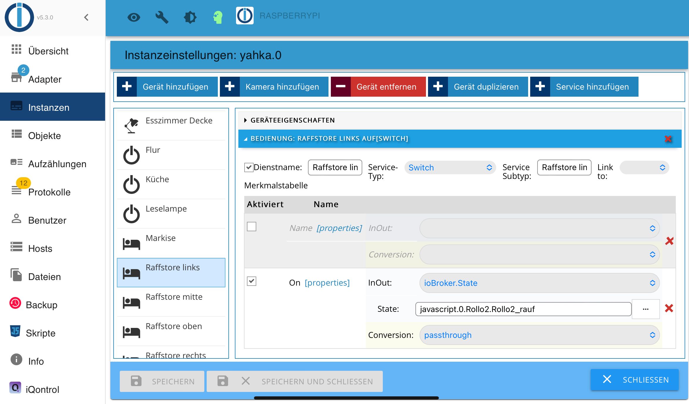 Die Steuerung via App funktioniert. Leider existiert für den ioBroker noch kein eigener Adapter, sodass der Umweg über Alexa bzw. den Alexa2 Adapter gegangen werden muss.
