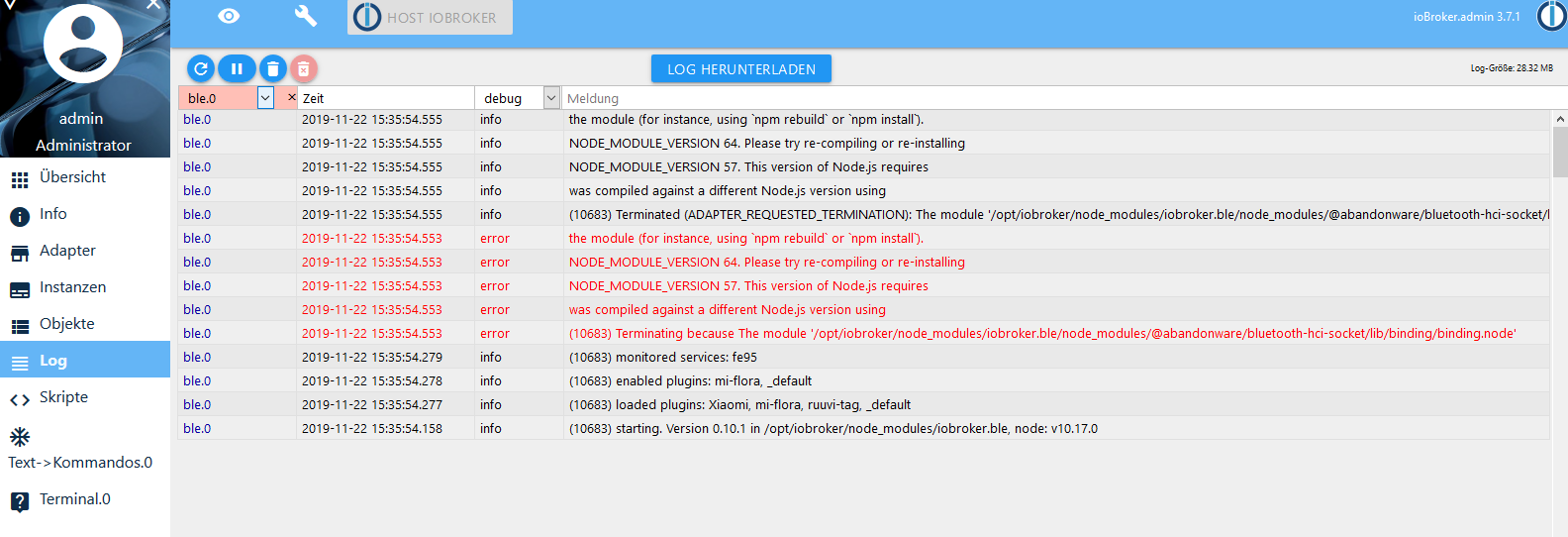 jetzt habe ich das Problem, dass der Backitup-Adapter nach einem Update auf 1.3.0 nicht mehr läuft. Muss wohl Node aktualisieren. Habe jetzt über die Konsole ein Backup erstellt. Ist das alles drin, was im minimal Backup auch drin wäre? Was ist denn eigentlich mit den ganzen VIS views, werden die auch gesichert? Die Erstellung der views war ja mit viel Aufwand verbunden...