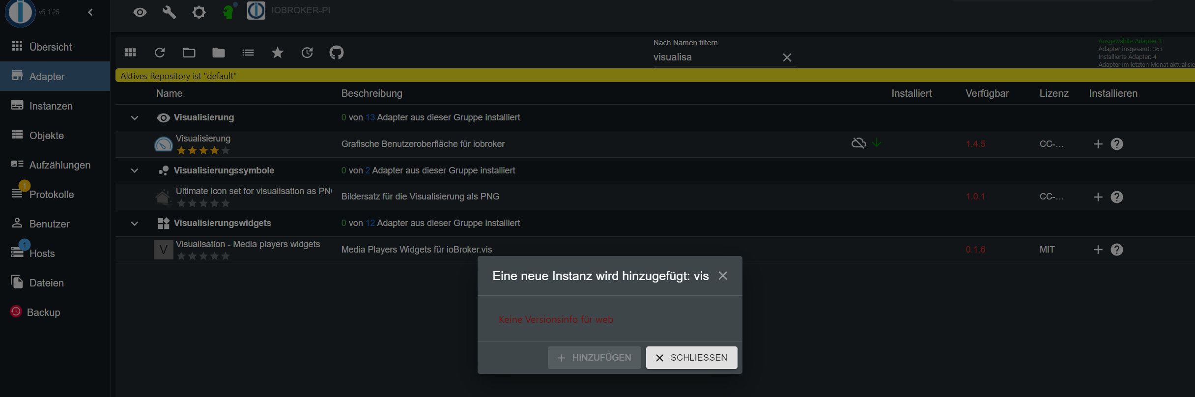 Auf der Seite "Adapter" den gewünschten Adapter suchen und auf das (+) klicken. Dann wird die notwendige Instanz erstellt.