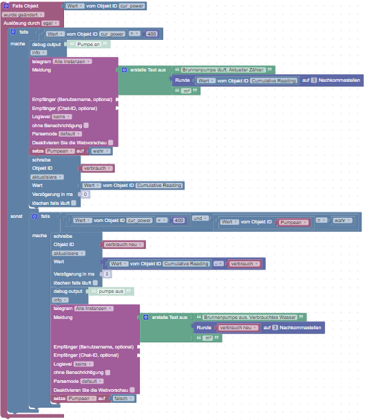 @damrak2022 sagte in Zeiten addieren und den Wert in Datenpunkt schreiben: @glasfaser Nicht wirklich, aber ich habe es schlichtweg nicht kapiert Was hast Du nicht kapiert? Der erste Befehl liest aus Deinem Datenpunkt den bislang aktuellen Wert aus Deinem Datenpunkt TV_Wohnzimmer_Tagesaktivität in eine Variable TV_Wohnzimmer. Das ist wichtig, wenn Du Dein System neu startest, dass dann die bislang ermittelte Aktivität nicht verloren geht. Der Zeitplan mit den 5 Sternen, bedeutet, er wird jede Minute ausgeführt. Was dann in dem Block steht: Schau in dem Power Datenpunkt des Shellie’s, ob dieser größer oder gleich 40W ist. Wenn ja dann zähle 1 in der Variablen TV_Wohnzimmer dazu. Da der Zeitplan ja alle Minuten ausgeführt wird, enthält diese Variable somit die Anzahl der Minuten die Dein TV aktiv ist. Der Inhalt dieser Variablen wird dann wieder in den Datenpunkt TV_Wohnzimmer_Tagesaktivität geschrieben und damit gesichert, falls Du Dein System neu startest oder der Strom ausfällt. Ich würde aber wie gesagt, statt steuere lieber aktualisiere nehmen. Um exakt 23:59 Uhr wird dann der aktuelle Wert der Variablen TV_Wohnzimmer in den Datenpunkt TV_Wohnzimmer_Tagesaktivität_History geschrieben, den Du dann mit Grafana auswertest. Er enthält also immer den Vortageswert und kann bzw. darf ja erst geschrieben werden, wenn ein Tag vollendet ist. Um exakt 0:00 Uhr wird die Variable TV_Wohnzimmer auf 0 gesetzt und dann in den Datenpunkt TV_Wohnzimmer_Tagesaktivität geschrieben, also genullt. Das ist das ganze Geheimnis. Wenn Du also nicht gerade Stromausfall über Mitternacht hast oder das System genau um Mitternacht neu startest, sollte es wie gewünscht arbeiten. Und falls Du Dir mit dem Blockly lesen, so schwer tust, solltest Du vielleicht doch mal über Alternativen nachdenken 😉😉😉 Theoretisch hättest man auch Punkt 3 und 4 zusammenfassen können, aber wichtig ist ja, dass Du generell verstehst, was warum gemacht wird.