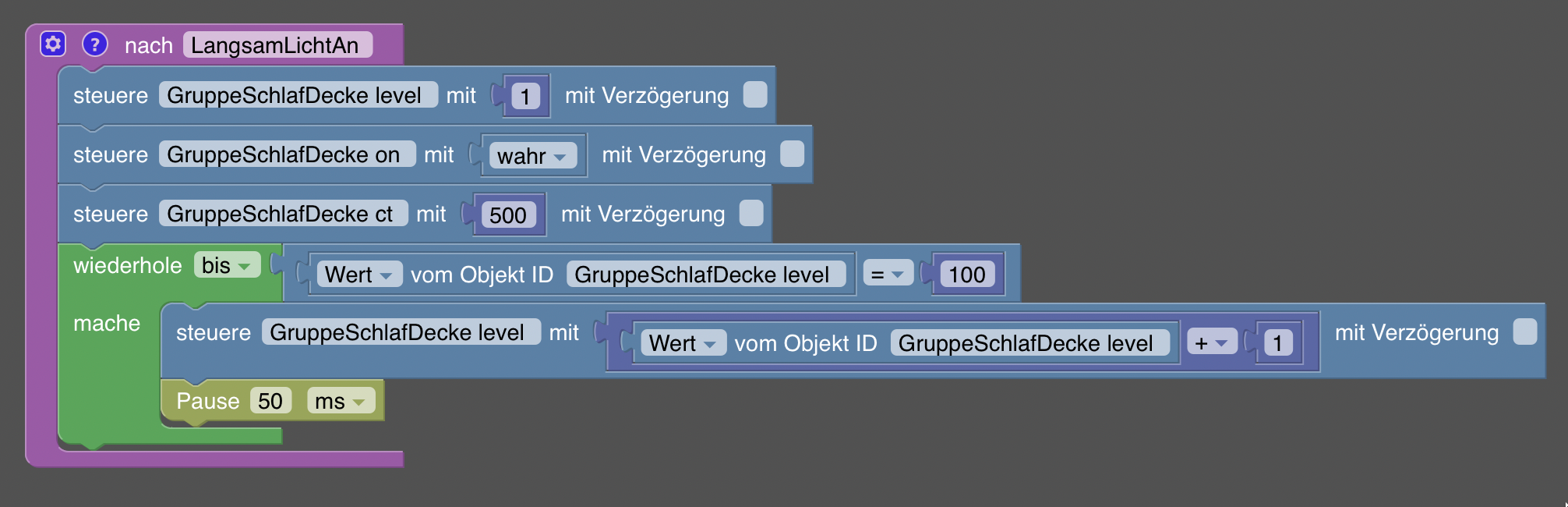 @Asgothian , Danke für den Tipp. Es war für mich nicht einfach, aber ich habe etwas hinbekommen. So schaut es nun aus, und es funktioniert erstmal: [image: 1672188075971-scr-20221228-2bd-resized.png] Ich habe herausgefunden, dass man die Lampen nicht einschalten muss, wenn man mit dem Level arbeitet. Aber beim herunterfahren, darf man nicht die 0 verwenden. Weil er dann nicht nimmt, sondern aus macht. Deswegen muss man zuerst auf 1% Level und danach manuell die Lampe aus setzen. Danke für eure Hilfe. Ich werde das nun eine Woche mal laufen lassen. Es wird uns alle gefallen. Ist viel ruhiger. =) Sonstiges: So schauen alle Möglichkeiten aus: [image: 1672188092697-scr-20221228-1yn-resized.png] Ich habe auch etwas mit "dimdown" , "dimup" und "dipspeed" gespielt, aber das habe ich nicht verstanden. Weder wie man das aktiviert, deaktiviert, oder verstellt. Was das genau macht, hat sich mir auch nicht erschlossen. Aber das mag auch sein, dass ich etwas anderes verstellt hatte. Diese beiden Knöpfe sind bei mir aktiviert, ich weiß gar nicht, was die machen, oder ob ich die jetzt wieder aus machen muss.