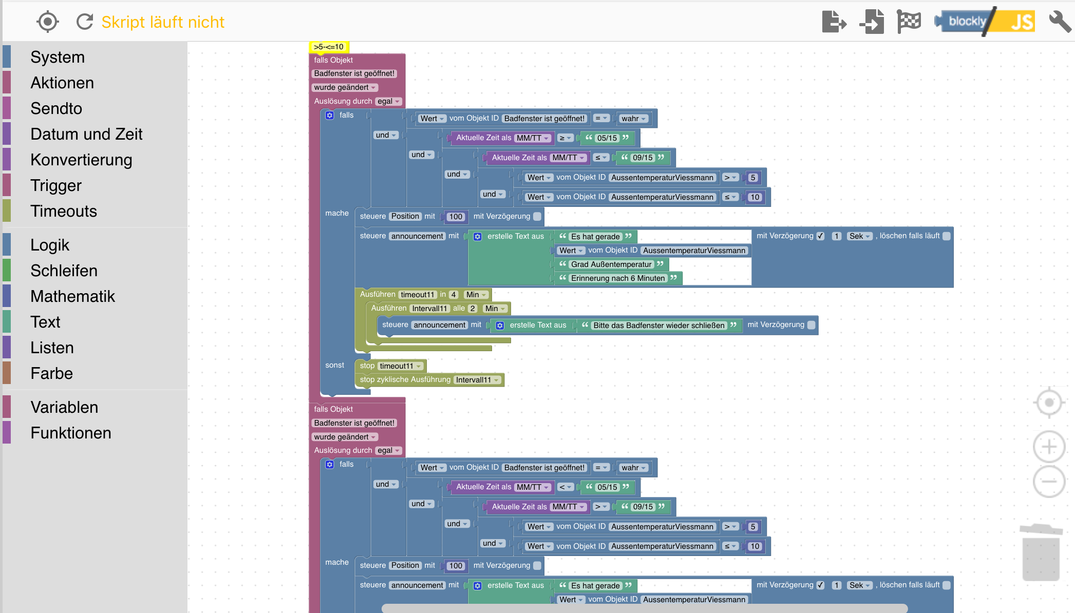 @labamba sagte: Lüftungszeiten im Winter die Raumtemperatur nicht unter 19 °C sinken soll oder dass im Sommer die Raumtemperatur nicht über 23 °C steigen soll. Sollte ich dies in dieses Skript mit aufnehmen oder ein seperates Skript anlegen. Das kommt darauf an, was das Ergebnis der Überwachung sein soll.