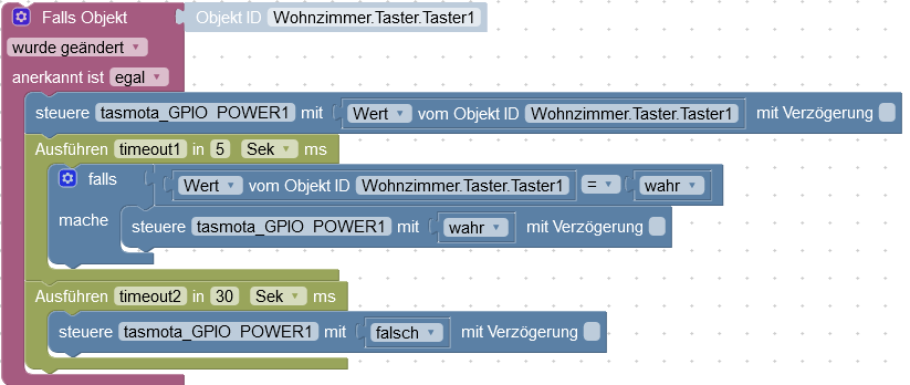 Ich habe gerade 2 Einzelscripte in eines zusammenkopiert. Das andere Script wertet einen zum Licht gehörenden Wandtaster aus. Da die Scripte themenmäßig zusammengehören, habe ich sie in eins kopiert und sehe jetzt im JavaScript Code auch, wie das mit dem Timeout funktioniert. Ich sehe, dass nun 2 Variablen angelegt wurden: timeout und timeout2, sodass diese jeweils ihren eigenen Callback haben.