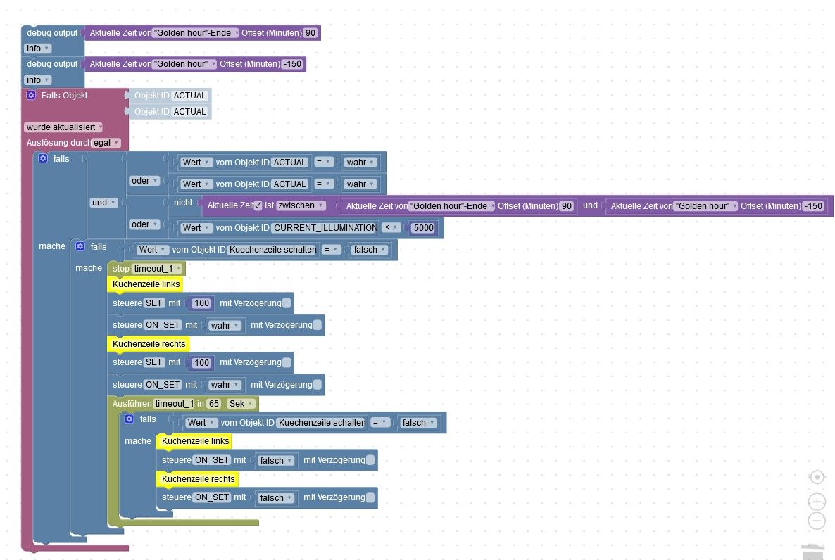 Das Licht geht nicht mehr aus, so lange es Bewegung in der Küche gibt, auch nicht wenn es mal 1 Minute keine Bewegung gibt. Ich kann es über Alexa und VIS schalten, wenn das der Fall ist, werden die BWM ignoriert und das Licht bleibt an. Wir das Licht manuell eingeschaltet und vergessen es wieder auszuschalten und es gibt keine Bewegung in der Küche, wird es nach x-Minuten automatisch ausgeschaltet. Im Bad das Gleiche, auch da funktioniert es so wie es soll.