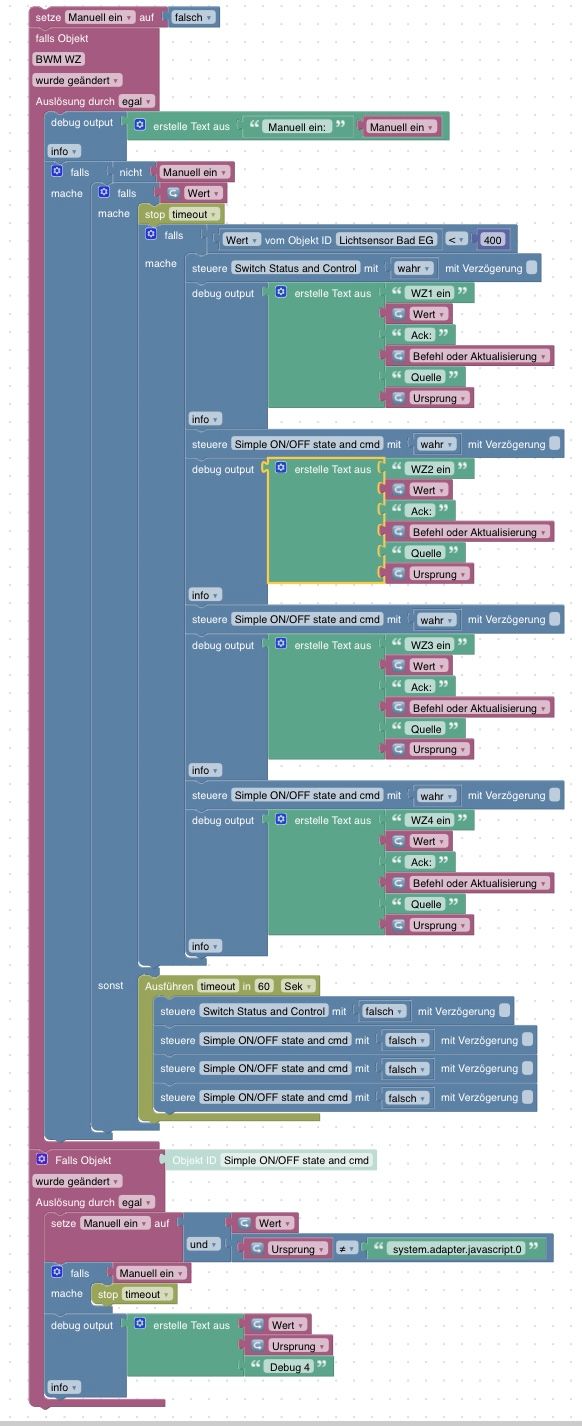 fritzdect.0 2023-10-10 17:48:04.419 info DECT ID: 130770137317-1 identified for command (state) : false fritzdect.0 2023-10-10 17:48:04.416 info DECT ID: 130770143150-1 identified for command (state) : false fritzdect.0 2023-10-10 17:48:04.413 info DECT ID: 130770151284-1 identified for command (state) : false javascript.0 2023-10-10 17:48:04.414 info script.js.Wohnzimmer.Finale_Wohnzimmerbeleuchtung1: falsesystem.adapter.javascript.0 Debug 4 fritzdect.0 2023-10-10 17:48:04.411 info DECT ID: 087610197338 identified for command (state) : false javascript.0 2023-10-10 17:47:04.405 info script.js.Wohnzimmer.Finale_Wohnzimmerbeleuchtung1: Manuell ein: false fritzdect.0 2023-10-10 17:46:32.436 info DECT ID: 130770151284-1 identified for command (state) : true fritzdect.0 2023-10-10 17:46:32.434 info DECT ID: 130770137317-1 identified for command (state) : true fritzdect.0 2023-10-10 17:46:32.431 info DECT ID: 130770143150-1 identified for command (state) : true javascript.0 2023-10-10 17:46:32.435 info script.js.Wohnzimmer.Finale_Wohnzimmerbeleuchtung1: truesystem.adapter.javascript.0 Debug 4 fritzdect.0 2023-10-10 17:46:32.429 info DECT ID: 087610197338 identified for command (state) : true javascript.0 2023-10-10 17:46:32.420 info script.js.Wohnzimmer.Finale_Wohnzimmerbeleuchtung1: true Debug 3 javascript.0 2023-10-10 17:46:32.420 info script.js.Wohnzimmer.Finale_Wohnzimmerbeleuchtung1: true Debug 3 javascript.0 2023-10-10 17:46:32.420 info script.js.Wohnzimmer.Finale_Wohnzimmerbeleuchtung1: true Debug 3 javascript.0 2023-10-10 17:46:32.420 info script.js.Wohnzimmer.Finale_Wohnzimmerbeleuchtung1: 0true Debug 2 javascript.0 2023-10-10 17:46:32.419 info script.js.Wohnzimmer.Finale_Wohnzimmerbeleuchtung1: system.adapter.zigbee.0true Debug 1 javascript.0 2023-10-10 17:46:32.419 info script.js.Wohnzimmer.Finale_Wohnzimmerbeleuchtung1: Manuell ein: falseEs funktioniert und das Protokoll sieht so aus.