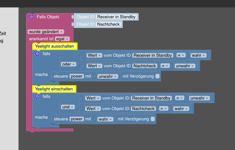 <statement name="STATEMENT"><block type="comment" id="0Uq*WE2I^QkX5J[9Tk^e"><field name="COMMENT">Yeelight ausschalten</field>