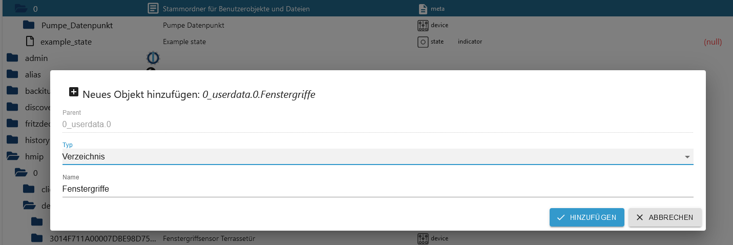 Dann oben darüber auf das+klicken und ein neues Objekt vom Typ Folder (Verzeichnis) mit dem NamenFenstergriffeanlegen -