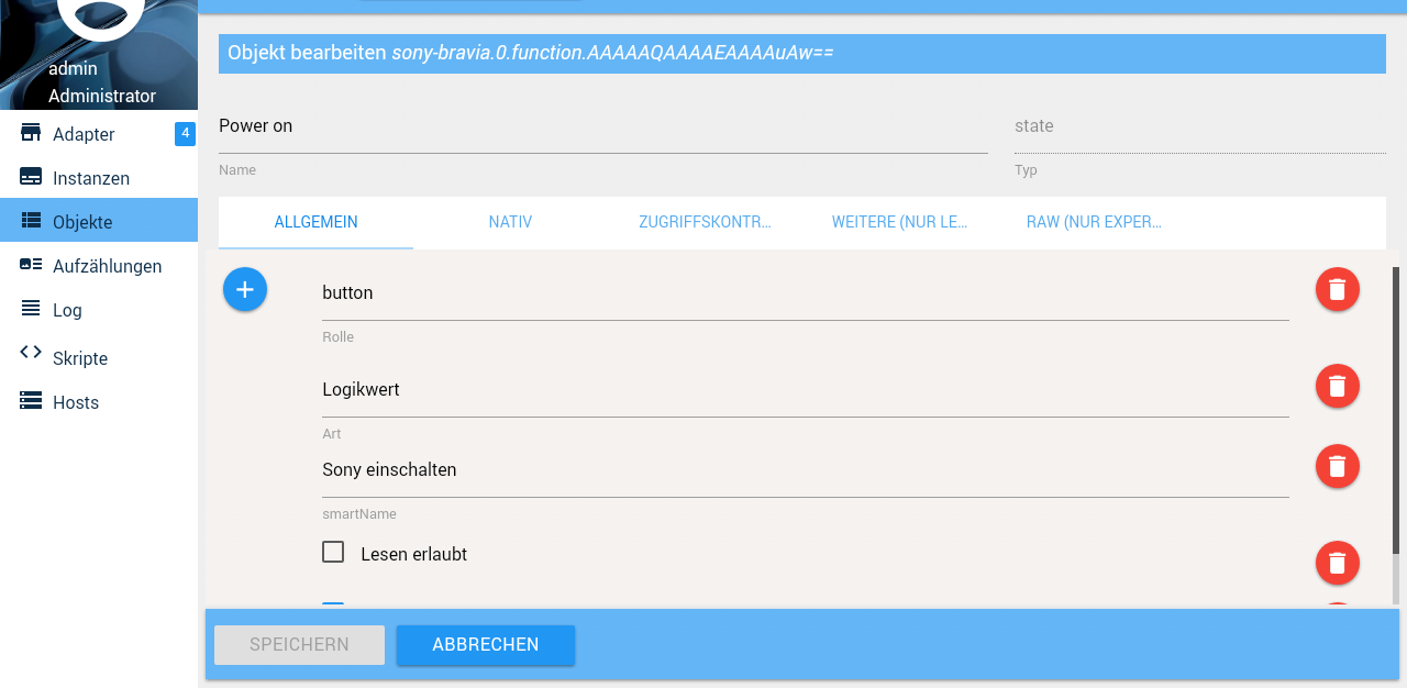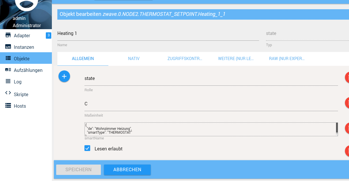 Alternativ kannst du sie auch mit "smartNamen" manuell einbinden. Das geht unter objecte, Genau an dem Daten Punkt, der eingebunden werden soll - Beispiel ist mit dem z-wave Adapter :)