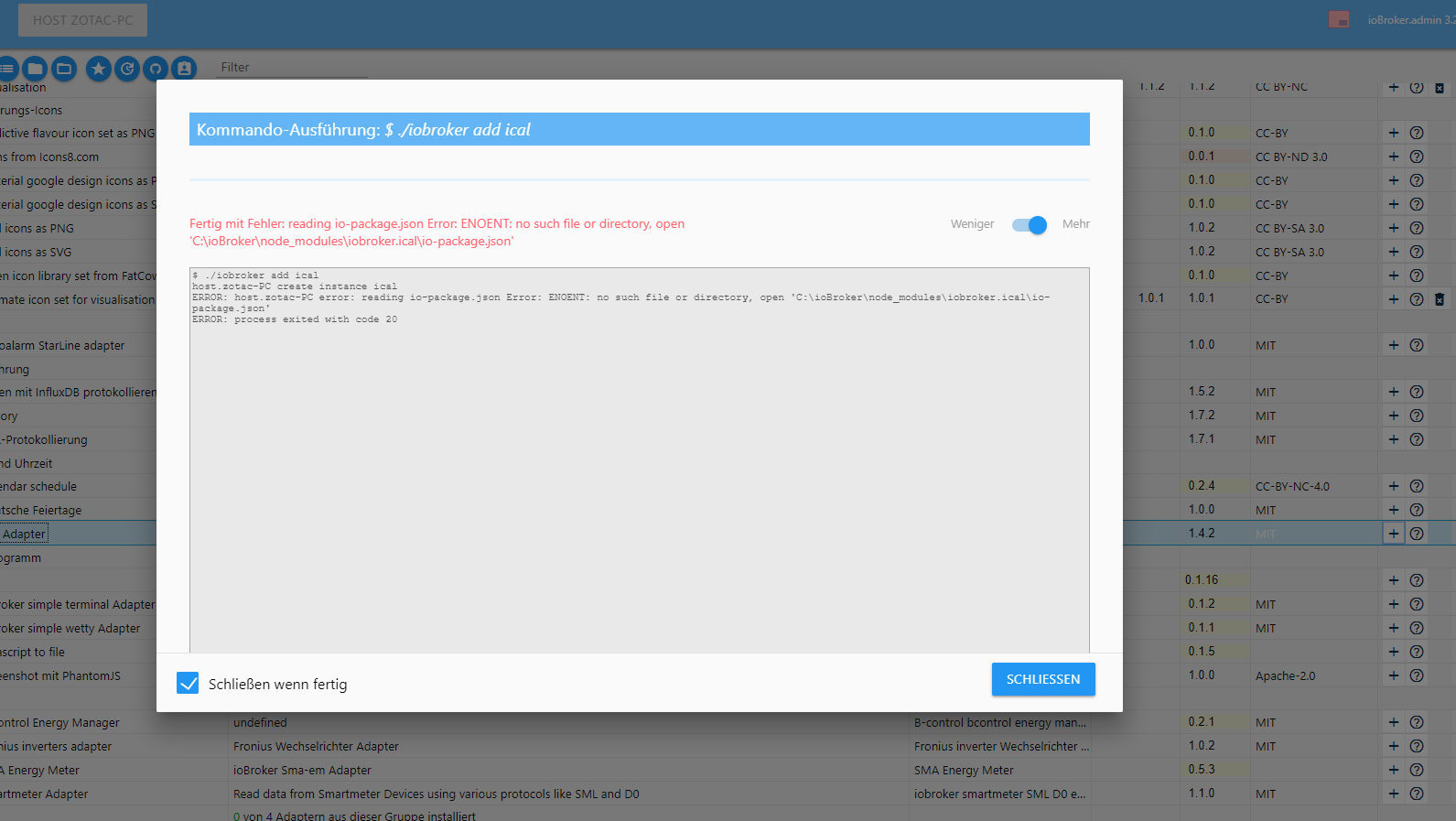 (Gelöst) ich kann auf windows ical nicht mehr installieren: Fehler io-package.json