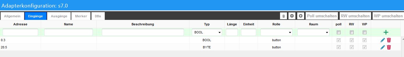 Nun zu meinen Problem ich habe als 1. bei meinen Logo Programm an die Eingänge Netzwerkeingänge angehangen das gleiche bei den Ausgängen mit Netzwerkausgänge. Und diese mit V0.0-V0.7 und V1.0-V1.7 usw. durch nummeriert und auf die Logo geladen. 2. Wie muss ich diese dann bei Iobroker nun unter Instanzen-Adapter S7 einfügen. Normal bei den Eingängen und den Ausgängen oder? Was muss ich außerdem bei Typ, Länge, Einheit und Rolle eintragen wenn es er den Ausgang der Logo abfragen soll und anzeigen soll bzw den Eingang schalten soll.