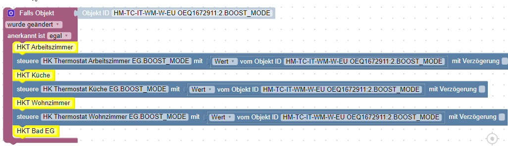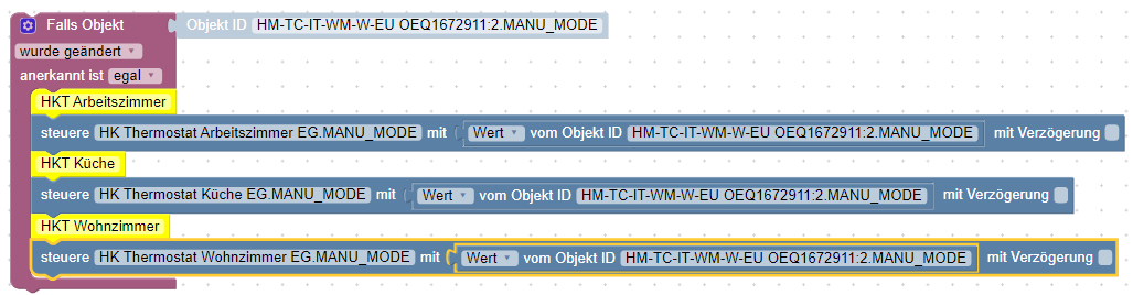 Sobald aber ich einen Heizkörperthermostat z.B. manuell schalte sollte das nicht auf alle Heizkörperthermostate übertragen werden sondern nur für den einen gelten.