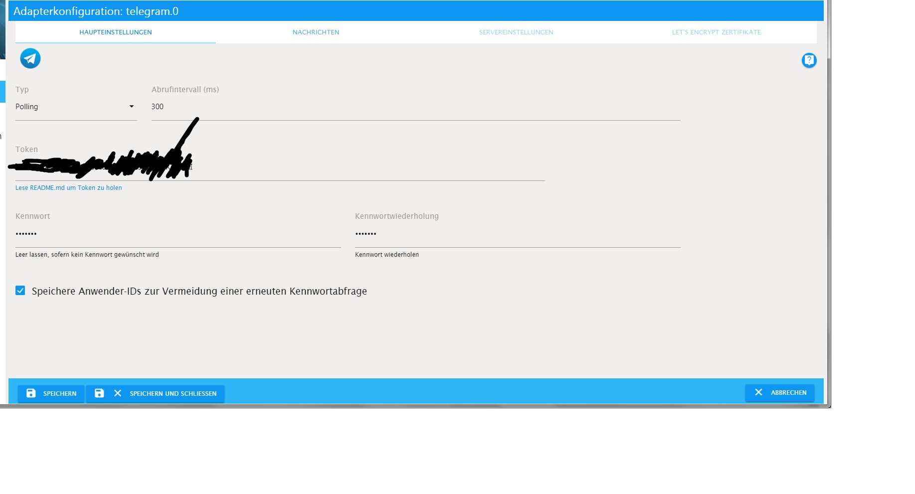 Hast du in den Telegram Adaptereinstellungen das Häkchen unter "Passwort speichern" gesetzt (oder nicht gesetzt)?