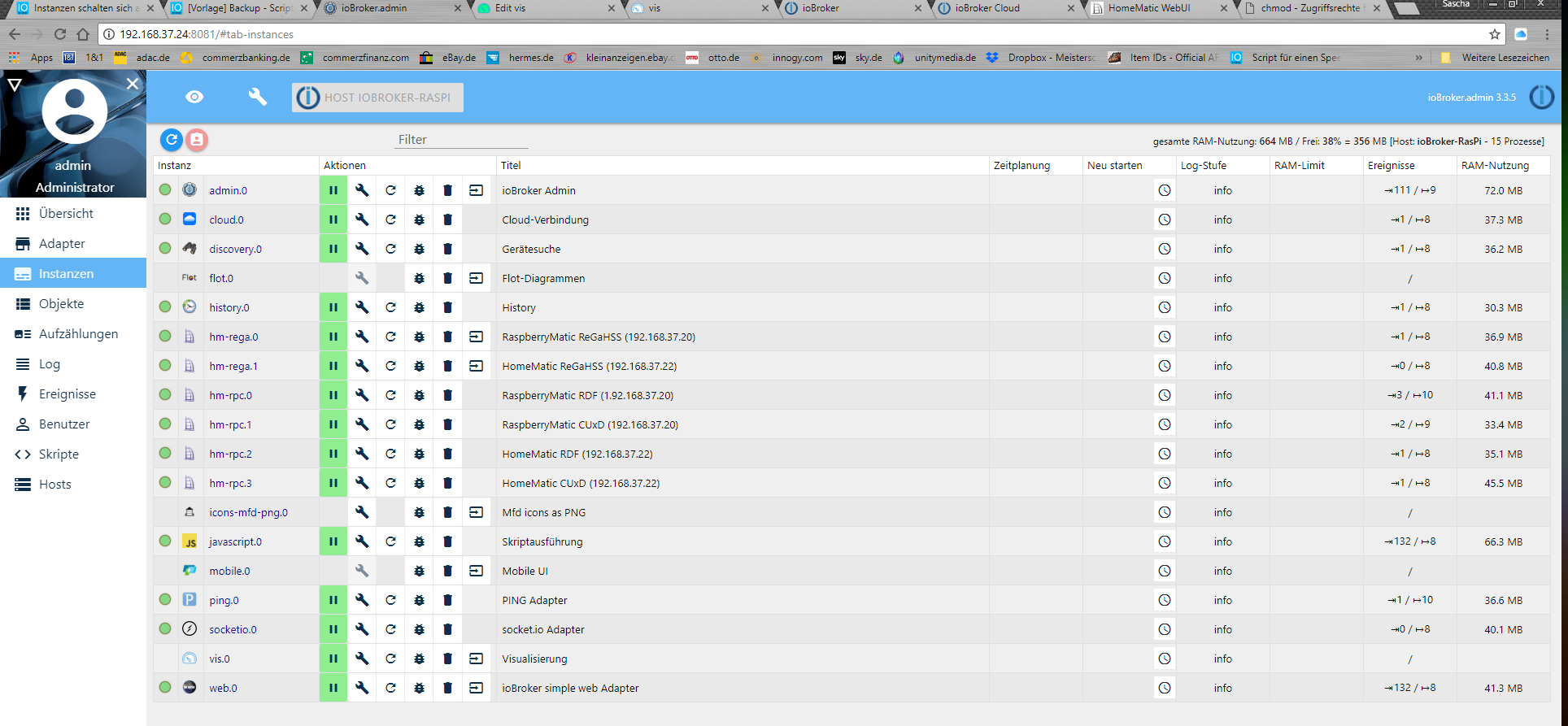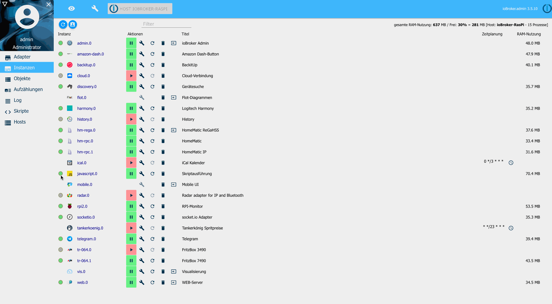 Wenn ich im iobroker auf "Instanzen" gehe, dann springen die immer mal wieder auf rot und werden dann wieder grün. Die Werte der Objekte stimmen dann aber nicht mehr, die werden erst nach (manuellem) Re-Start des Adapters wieder korrekt.