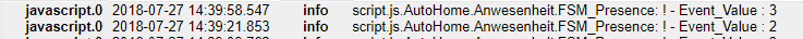 Eine Änderung dieser Variablen triggert wiederum eine Skript"FSM_Presence" indem dann der aktuelle Anwesenheitsstatus als Zahl gesetzt wird. Im zweiten Schritt werde ich noch eine "PrePresence" setzten um damit feststellen zu können war gerade nach Hause gekommen ist oder gegangen ist usw.