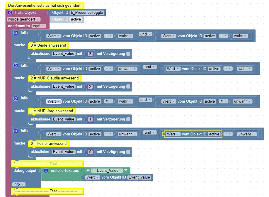 Ändert sich der Handystatus , d.h medet sich ein Handy im Netzwerk an oder ab, wir das Skript getriggert. Schön und gut. Wenn ich mir den Status der Variablen "Event_Value" in der Objekte Übersicht ansehe passt der Zustand auch. Die Debug-Ausgabe innerhalb des Skripts gibt allerdings ein falsches Ergebnis aus und zwar immer den vorherigen Status der Variable "Event_Value".