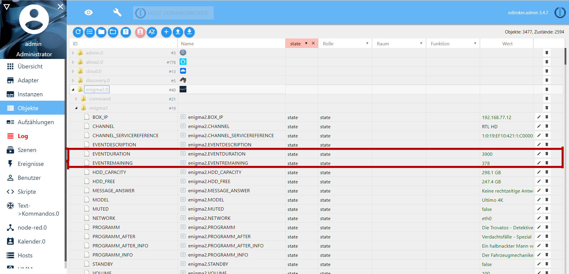 <xml xmlns="http://www.w3.org/1999/xhtml"><block type="schedule" id="jg,*ep8bq!R(@5iXlz2g" disabled="true" x="-637" y="-512"><field name="SCHEDULE">* * * * *</field> <statement name="STATEMENT"><block type="update" id=")[O,S`5QnJ=Gu+1xAQLb"><mutation delay_input="false"></mutation> <field name="OID">Geräte.0.Dreambox.Zeit</field> <field name="WITH_DELAY">FALSE</field> <value name="VALUE"><block type="math_arithmetic" id="U7MY9VE{Qqxrc@iBA0|]"><field name="OP">MINUS</field> <value name="A"><shadow type="math_number" id="hK!1PX:,XbbjUiFffUT4"><field name="NUM">0</field></shadow> <block type="get_value" id="L|959Z^~5CjysB5K/%zS"><field name="ATTR">val</field> <field name="OID">Geräte.0.Dreambox.Anfangszeit</field></block></value> <value name="B"><shadow type="math_number" id="Gk}]HC+B_dTrb4:I8T5V"><field name="NUM">0</field></shadow> <block type="get_value" id="0C%6*LIcjkK2-|~g~}6t"><field name="ATTR">val</field> <field name="OID">Geräte.0.Dreambox.Endzeit</field></block></value></block></value></block></statement> <next><block type="on" id="}Py/yl![s8I(?KGZ4Wo0"><field name="OID">enigma2.0.enigma2.EVENTDURATION</field> <field name="CONDITION">ne</field> <statement name="STATEMENT"><block type="update" id="QWRK9hRBL19.-N5!8_fD"><mutation delay_input="false"></mutation> <field name="OID">Geräte.0.Dreambox.Anfangszeit</field> <field name="WITH_DELAY">FALSE</field> <value name="VALUE"><block type="math_arithmetic" id="5mR=LM`DKYv-]=|41MMl"><field name="OP">DIVIDE</field> <value name="A"><shadow type="math_number" id="hK!1PX:,XbbjUiFffUT4"><field name="NUM">0</field></shadow> <block type="get_value" id="%YT%DTUxE1dYJ5JBnuY["><field name="ATTR">val</field> <field name="OID">enigma2.0.enigma2.EVENTDURATION</field></block></value> <value name="B"><shadow type="math_number" id="v`kV-M=g,)^pFMdGxi1~"><field name="NUM">60</field></shadow></value></block></value></block></statement> <next><block type="on" id="%%i;c-4{2J}~.cb8AQr;"><field name="OID">enigma2.0.enigma2.EVENTREMAINING</field> <field name="CONDITION">ne</field> <statement name="STATEMENT"><block type="update" id="u/*j=5q[R1e[+mBry(F-"><mutation delay_input="false"></mutation> <field name="OID">Geräte.0.Dreambox.Endzeit</field> <field name="WITH_DELAY">FALSE</field> <value name="VALUE"><block type="math_arithmetic" id="nK07H?-T%jAs_Zy*3YgF"><field name="OP">DIVIDE</field> <value name="A"><shadow type="math_number" id="hK!1PX:,XbbjUiFffUT4"><field name="NUM">0</field></shadow> <block type="get_value" id="5/WGZI6qOn;A.371y`Nf"><field name="ATTR">val</field> <field name="OID">enigma2.0.enigma2.EVENTREMAINING</field></block></value> <value name="B"><shadow type="math_number" id="-rSPJ/^#OX9Gtx,GX851"><field name="NUM">60</field></shadow></value></block></value> <next><block type="update" id="zrJi{OB7QRs{a}xtGIi0"><mutation delay_input="false"></mutation> <field name="OID">Geräte.0.Dreambox.Zeit</field> <field name="WITH_DELAY">FALSE</field> <value name="VALUE"><block type="math_arithmetic" id="PI]elxd*@70:7mQ`xiz1"><field name="OP">MINUS</field> <value name="A"><shadow type="math_number" id="hK!1PX:,XbbjUiFffUT4"><field name="NUM">0</field></shadow> <block type="get_value" id="YFJL^KN7QF*@=C^)hNAl"><field name="ATTR">val</field> <field name="OID">Geräte.0.Dreambox.Anfangszeit</field></block></value> <value name="B"><shadow type="math_number" id="Gk}]HC+B_dTrb4:I8T5V"><field name="NUM">0</field></shadow> <block type="get_value" id="VMl=kHq.DUb!N^Bmf@ew"><field name="ATTR">val</field> <field name="OID">Geräte.0.Dreambox.Endzeit</field></block></value></block></value></block></next></block></statement></block></next></block></next></block></xml>Dann greifst Du im VIS die neu angelegten Datenpunkte ab.