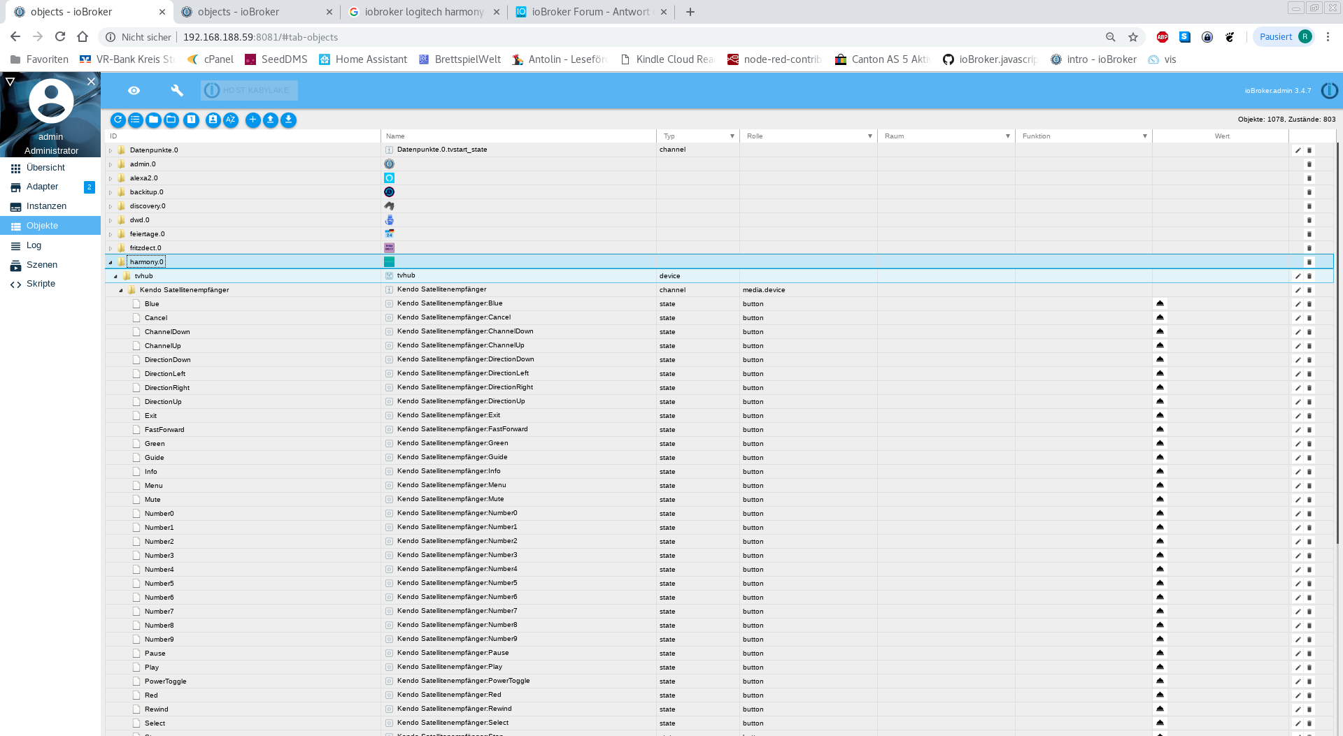 Ich möchte einen beliebigen Button, die als Objekt unter harmony.0 gelistet sind (Siehe Screenshot) ausführen. Da klappt bei einigen über "Tastendruck simulieren" im Objekte-Ordner, also funktioniert der Adapter schon mal.