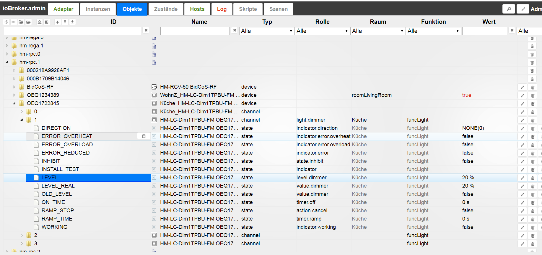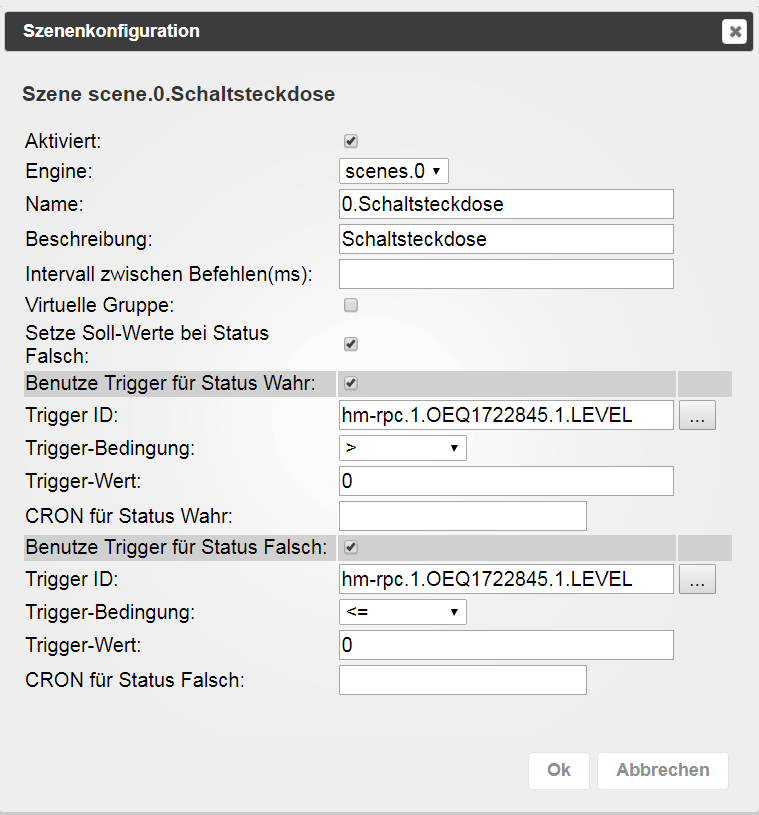 Die Szene soll den Zustand WAHR einnehmen, wenn am Dimmer (HM-LC-Dim1TPBU-FM) der Dimmwert >0% ist und den Zustand FALSCH annehmen, wenn der Dimmwert = 0% ist.
