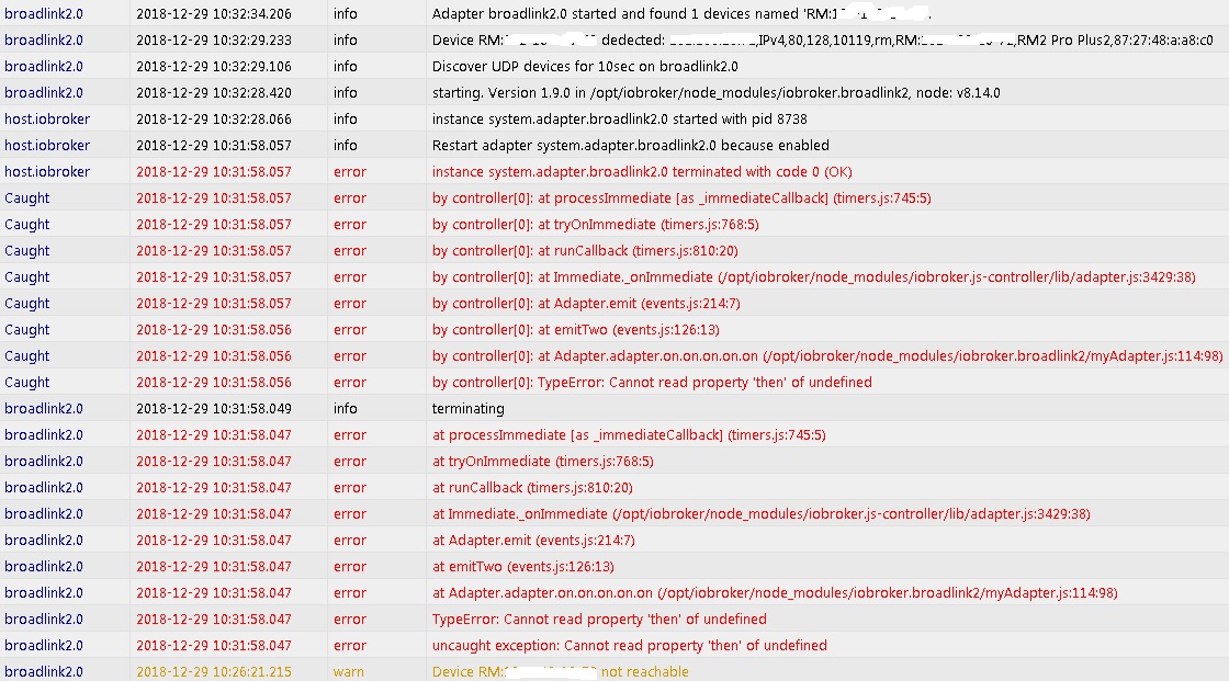 Nun zeigt mir der Broadlink im log not reachble an, Adapter is grün…..deswegen wird er wahrscheinlich so spät schalten.....