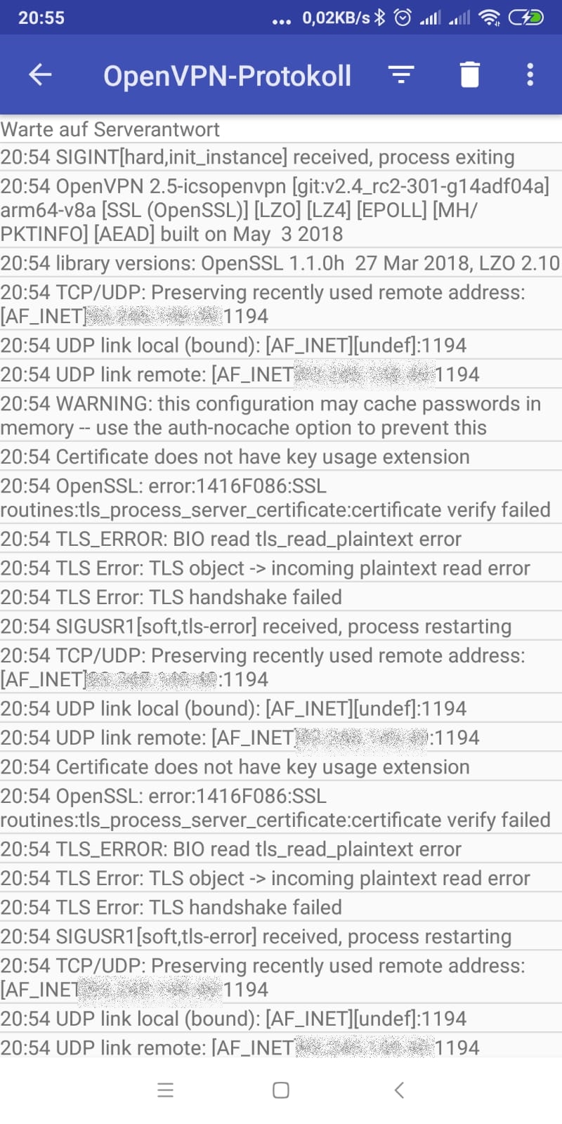Im Log steht, dass das Zertifikat nicht verifiziert werden konnte. Damit kann ich jetzt adhoc nichts anfangen. Ich habe auch kein Android Telefon, kann das also nicht testen.
