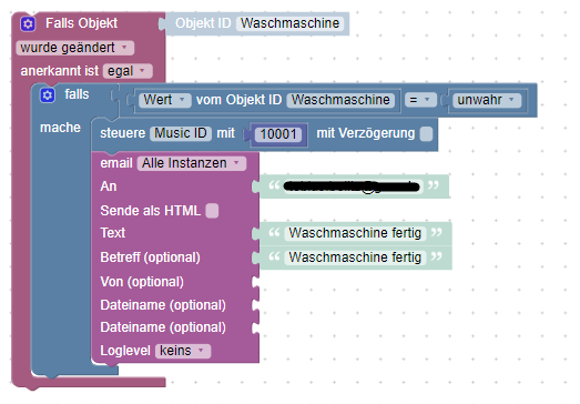 Wenn die Waschmaschine „fertig“ ist soll ein Ton ertönen und eine E-Mail geschickt werden.
