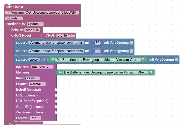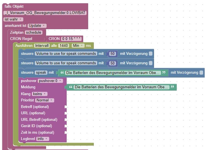 Das Script sollte darum jeden Tag einmal laufen (zB 15:00) damit es mich solang dran erinnert die Batterien zu tauschen bis ich dann auch im Baumarkt war, welche gekauft hab und diese wechsle