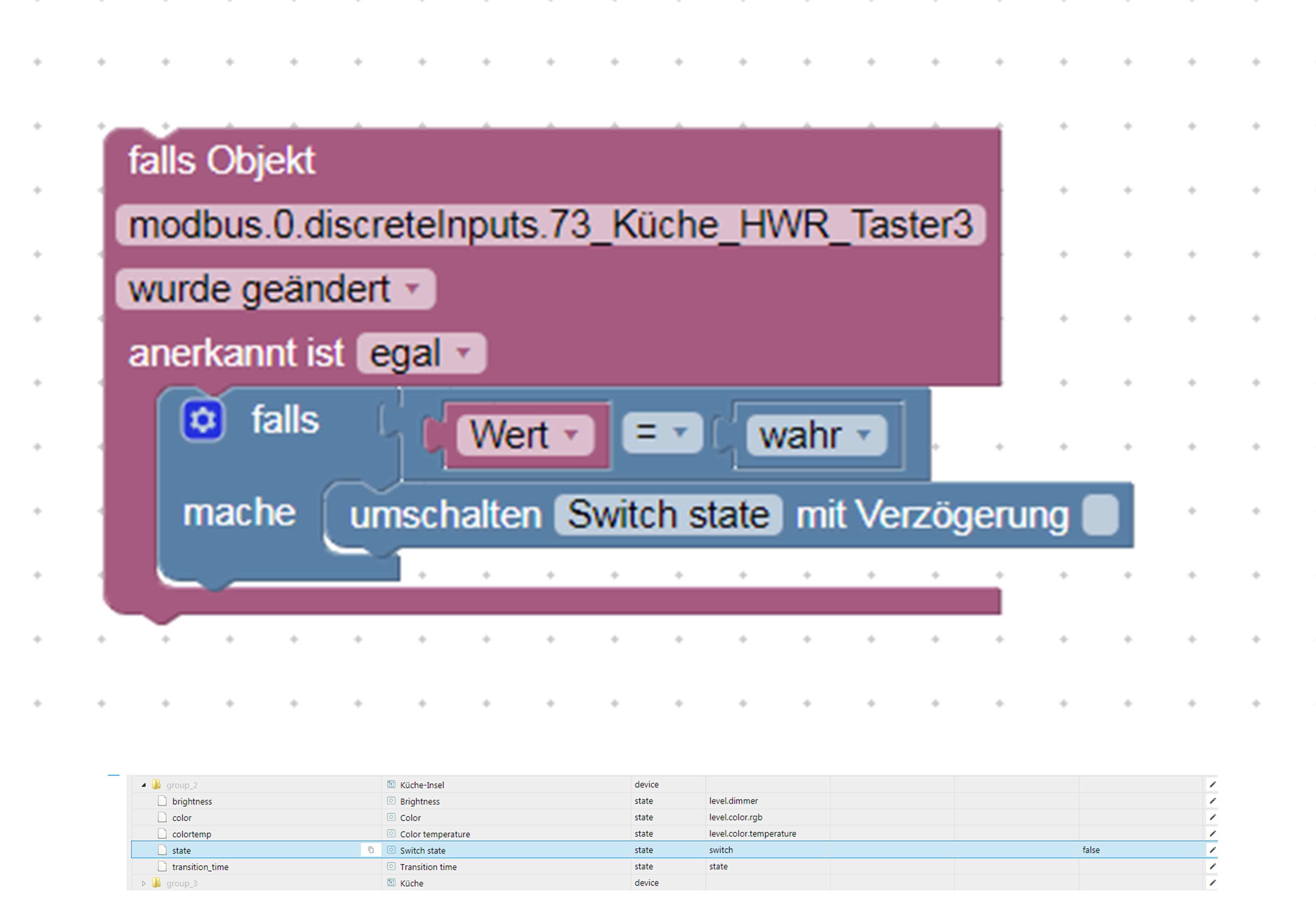 ich habe mit einer Wago 750-881 per Modbus die Lichtschalter in Iobroker integriert. Jetzt würde ich gerne die Zigbee Lampen Gruppe damit steuern. Funktioniert aber nicht. Die Eingangsseite geht, habe statt dem Zigbee mal ein Telegram verschickt was auch geht. Manuell wiederrum kann ich aber auch die Zigbee Gruppe schalten. Was läuft da schief?