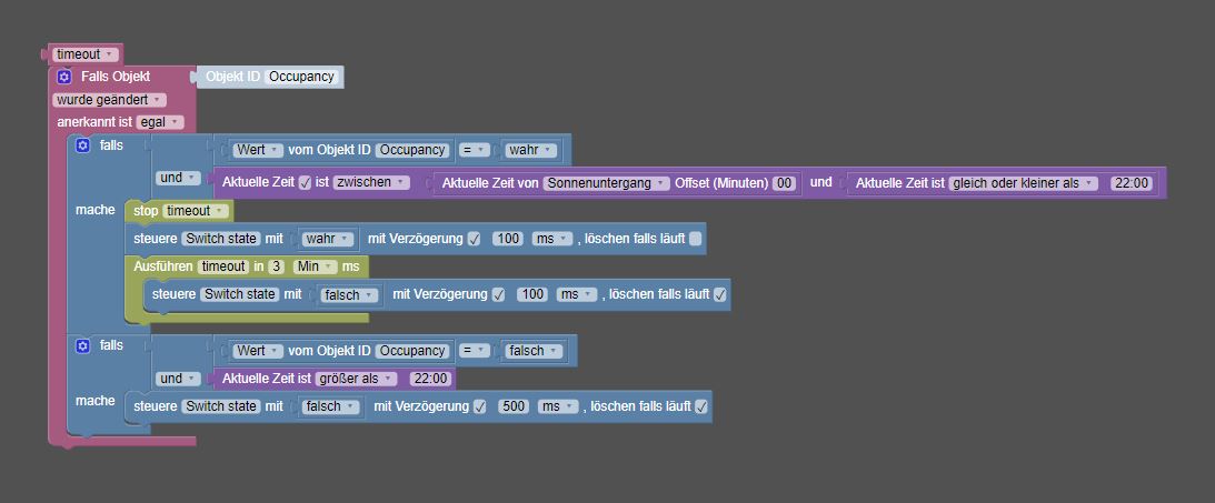 Der Trigger für "Last motion" düfte jede Sekunde angestoßen und in den ersten "Falls-Block" reinlaufen.Ich komme heute wohl zum umbauen, entferne die nicht-verknüpfte Variable und ändere die zeitlichen Bedingungen.