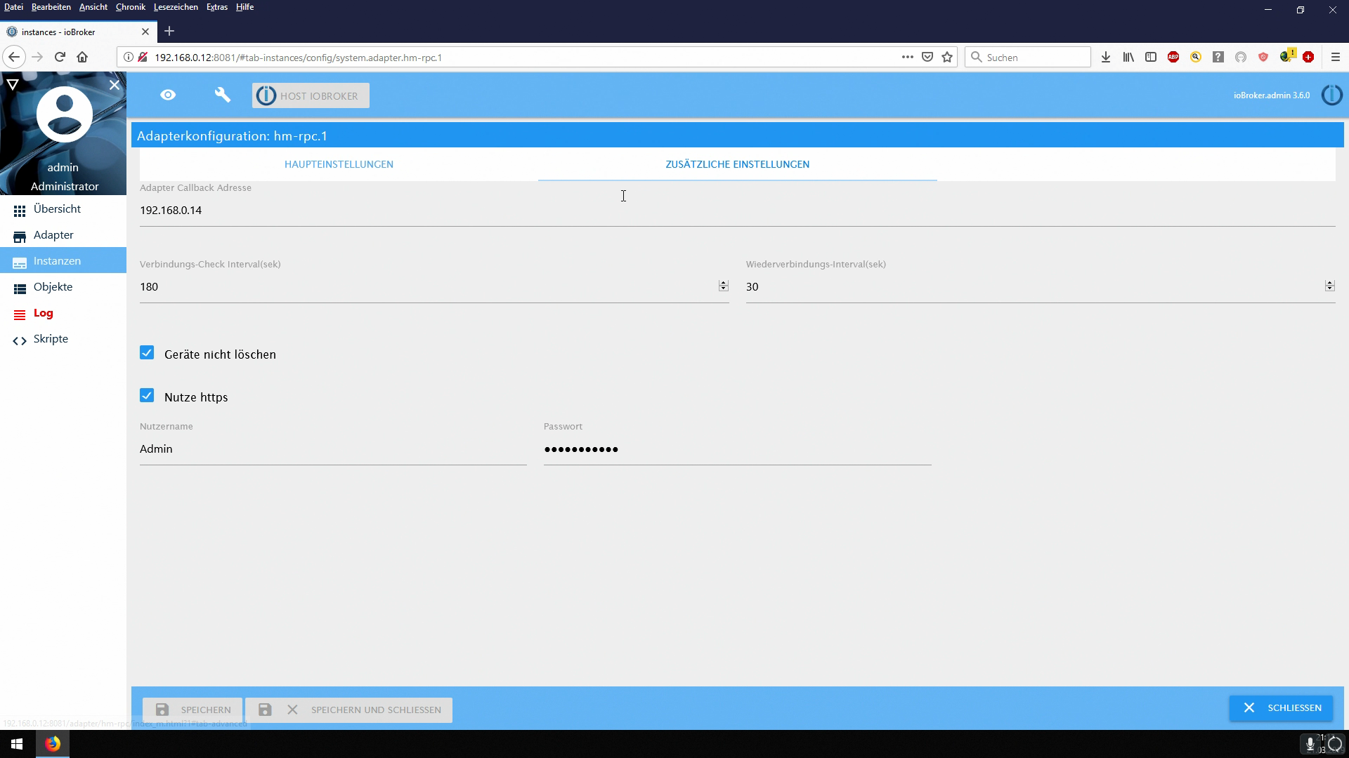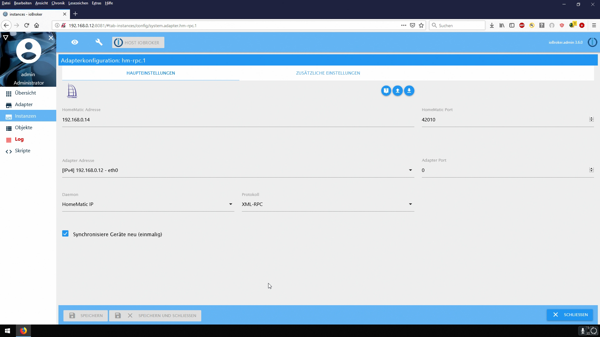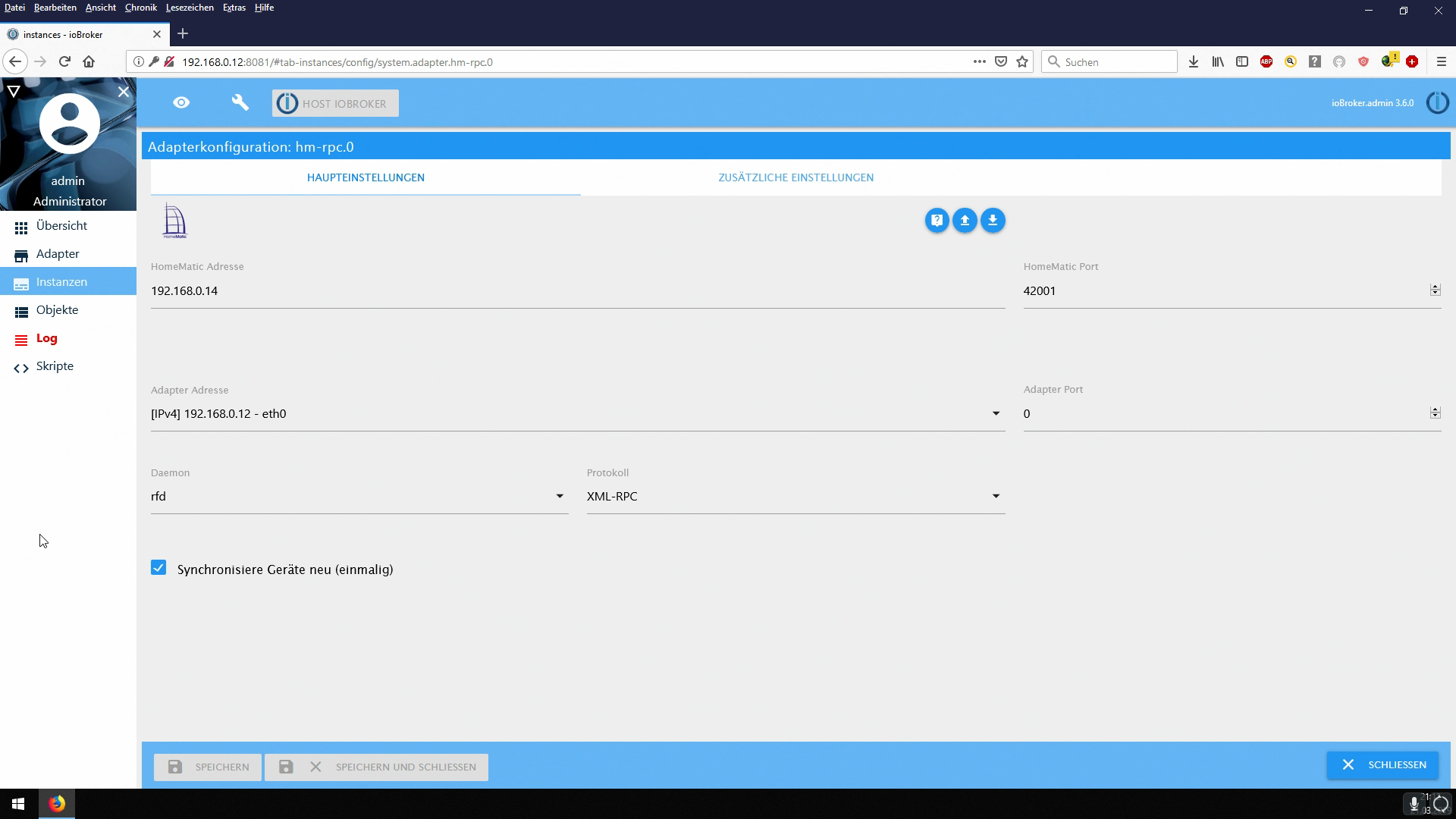 hm-rpc.0 v1.9.9 für HM (IP/Callbeck Adresse wie die CCU; Adapter Adresse eth0 "IP von iobroker; rfd; XML-RPC; Sync ist an; HM-Port 42001; Adaperport 0; Nutze https Logindaten von der CCU)