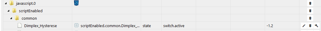 <xml xmlns="http://www.w3.org/1999/xhtml"> <block type="on" id="Hl%(4#W)fQO8/To4.CmS" x="13" y="13"> <field name="OID">modbus.0.holdingRegisters.2_Rücklauftemperatur</field> <field name="CONDITION">ne</field> <field name="ACK_CONDITION"></field> <statement name="STATEMENT"> <block type="controls_if" id="E6pk_n:qj*ulZ1kj!k(Y"> <value name="IF0"> <block type="get_value" id="l77|%l!T0+X2KsLi`2L#"> <field name="ATTR">val</field> <field name="OID">modbus.0.holdingRegisters.2_Rücklauftemperatur</field> </block> </value> <statement name="DO0"> <block type="update" id="RLUjkfaG-5BZw3o?X5Kd"> <mutation delay_input="false"></mutation> <field name="OID">javascript.0.Dimplex_Hysterese</field> <field name="WITH_DELAY">FALSE</field> <value name="VALUE"> <block type="math_rndfixed" id="Y,;qzf-9-D8{3f-KNrT3"> <field name="n">1</field> <value name="x"> <shadow type="math_number" id="ph#yNZ(%pE[.r.Ej6y{7"> <field name="NUM">3.1234</field> </shadow> <block type="math_arithmetic" id="hr27BRca5{-GS0wwjV1U"> <field name="OP">MINUS</field> <value name="A"> <shadow id="Eqe%On}YG/{:BA%v?Shg" type="math_number"> <field name="NUM">1</field> </shadow> <block type="get_value" id="^xSA*|DNw=UpSRv#wiz9"> <field name="ATTR">val</field> <field name="OID">modbus.0.holdingRegisters.2_Rücklauftemperatur</field> </block> </value> <value name="B"> <shadow id="R8g1Mt3=Cv;@-%iqPi#m" type="math_number"> <field name="NUM">1</field> </shadow> <block type="get_value" id="XRmWb59k)UR}e3MWTTD~"> <field name="ATTR">val</field> <field name="OID">modbus.0.holdingRegisters.53_Rücklaufsolltemperatur</field> </block> </value> </block> </value> </block> </value> </block> </statement> </block> </statement> </block> </xml>@stefantaust