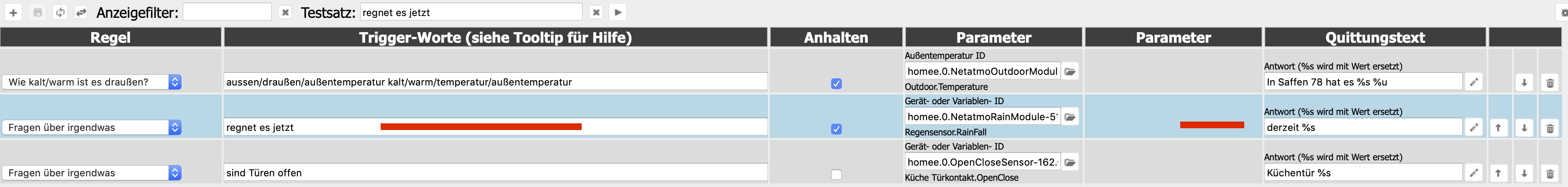 Der Testsatz lautet "regnet es jetzt" Der Rückgabe Wert ist "derzeit 0" Der Wert kommt vom Netatmo Regensensor. Aber über Alexa bekomme ich keine Antwort.