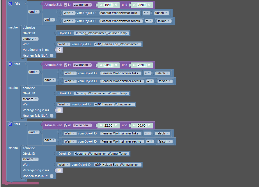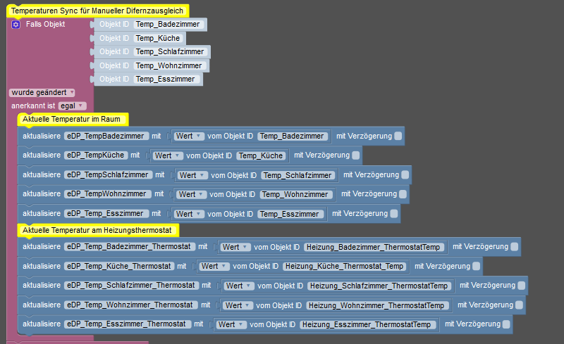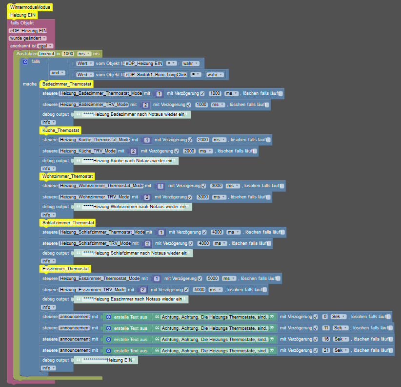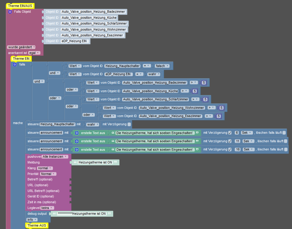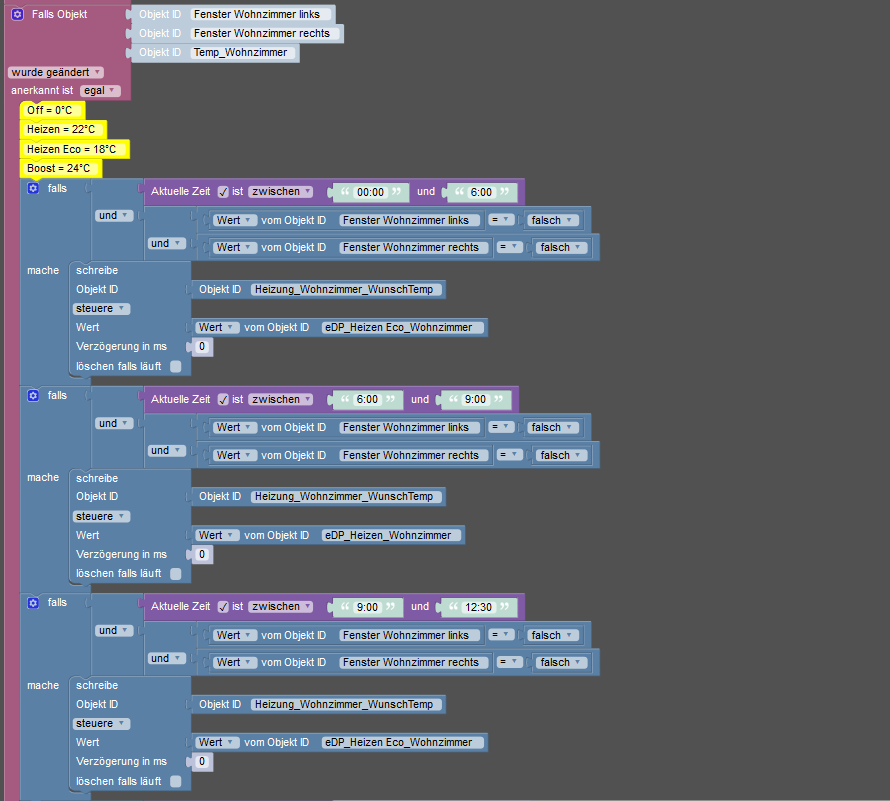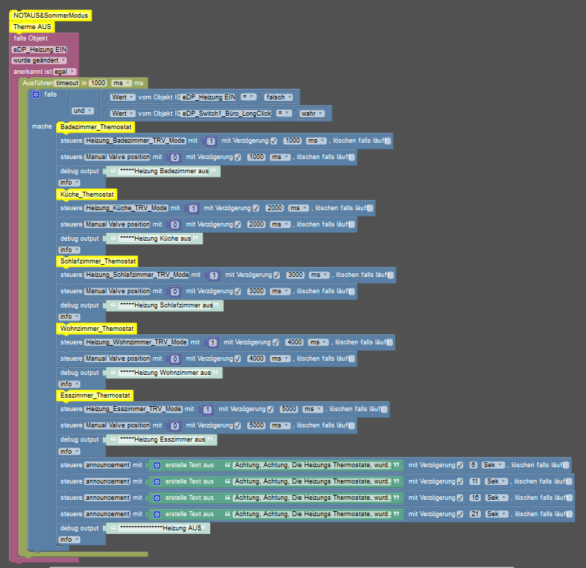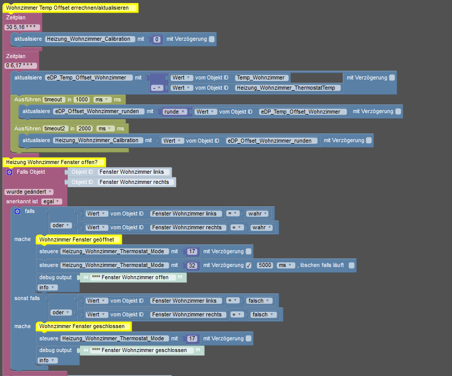 <xml xmlns="http://www.w3.org/1999/xhtml"> <variables> <variable type="undefined" id="timeout">timeout</variable> <variable type="undefined" id="timeout2">timeout2</variable> </variables> <block type="comment" id="ND7B:p`Kur]#qYE;%!!A" x="63" y="13"> <field name="COMMENT">Wohnzimmer Temp Offset errechnen/aktualisieren</field> <next> <block type="schedule" id="!,4Wgf}wba([Pab8mCKQ"> <field name="SCHEDULE">30 5,16 * * *</field> <statement name="STATEMENT"> <block type="update" id="wkEvWD95FUEzZ(-ugrmk"> <mutation delay_input="false"></mutation> <field name="OID">zigbee.0.00158d0001922dcd.local_temp_calibration</field> <field name="WITH_DELAY">FALSE</field> <value name="VALUE"> <block type="math_number" id="5m,U.n5zS=0?SeZjk!J-"> <field name="NUM">0</field> </block> </value> </block> </statement> <next> <block type="schedule" id="6{wK{v?`BC]Y}4fyl~Da"> <field name="SCHEDULE">0 6,17 * * *</field> <statement name="STATEMENT"> <block type="update" id="/!dURqPYB4Kcv6a|d}52"> <mutation delay_input="false"></mutation> <field name="OID">#Eigene.0.Wohnzimmer.Offset_Wohnzimmer</field> <field name="WITH_DELAY">FALSE</field> <value name="VALUE"> <block type="math_arithmetic" id="`jcD8mn()moBT)LQV646" inline="false"> <field name="OP">MINUS</field> <value name="A"> <shadow type="math_number" id=";Rs;ySHmvjmz)EuTD?#;"> <field name="NUM">1</field> </shadow> <block type="get_value" id="LmJ-.Lf%lJ*Y;=SN!PmW"> <field name="ATTR">val</field> <field name="OID">mihome.0.devices.weather_v1_158d0002c90c49.temperature</field> </block> </value> <value name="B"> <shadow type="math_number" id="E7c2=#F/EjnO*1XgTpQ9"> <field name="NUM">1</field> </shadow> <block type="get_value" id="ove1r.6/LMC=Is?5WXRX"> <field name="ATTR">val</field> <field name="OID">zigbee.0.00158d0001922dcd.local_temp</field> </block> </value> </block> </value> <next> <block type="timeouts_settimeout" id="IGAww:Y/C[aWwH.r.Lz#"> <field name="NAME">timeout</field> <field name="DELAY">1000</field> <field name="UNIT">ms</field> <statement name="STATEMENT"> <block type="update" id="9wO9S`yz_o8pP9KhaF(B"> <mutation delay_input="false"></mutation> <field name="OID">#Eigene.0.Wohnzimmer.Offset_Wohnzimmer_runden</field> <field name="WITH_DELAY">FALSE</field> <value name="VALUE"> <block type="math_round" id="_4F}),A8Kacj5T6y+B7G"> <field name="OP">ROUND</field> <value name="NUM"> <shadow type="math_number" id=",/derboODGi]Xe[DlD(F"> <field name="NUM">3.1</field> </shadow> <block type="get_value" id="]hogbYFvMQ.-TCINU25K"> <field name="ATTR">val</field> <field name="OID">#Eigene.0.Wohnzimmer.Offset_Wohnzimmer</field> </block> </value> </block> </value> </block> </statement> <next> <block type="timeouts_settimeout" id="7W1zv{msNVwbbS=KFNR5"> <field name="NAME">timeout2</field> <field name="DELAY">2000</field> <field name="UNIT">ms</field> <statement name="STATEMENT"> <block type="update" id=")1O{ljc2NsbhJKJ=EU4u"> <mutation delay_input="false"></mutation> <field name="OID">zigbee.0.00158d0001922dcd.local_temp_calibration</field> <field name="WITH_DELAY">FALSE</field> <value name="VALUE"> <block type="get_value" id="4b-gE=hje`qq`N7I}*m}"> <field name="ATTR">val</field> <field name="OID">#Eigene.0.Wohnzimmer.Offset_Wohnzimmer_runden</field> </block> </value> </block> </statement> </block> </next> </block> </next> </block> </statement> <next> <block type="comment" id="`yA`eQ!Wr;9!U|,0J6h~"> <field name="COMMENT">Heizung Wohnzimmer Fenster offen?</field> <next> <block type="on_ext" id="6Sugyb:[P1(VMVaw.l8|"> <mutation items="2"></mutation> <field name="CONDITION">ne</field> <field name="ACK_CONDITION"></field> <value name="OID0"> <shadow type="field_oid" id=",~yJ,tyc)xKV?990H!N?"> <field name="oid">mihome.0.devices.magnet_158d00025f0b84.state</field> </shadow> </value> <value name="OID1"> <shadow type="field_oid" id="/!*7SxF3^Pa8O6{MO5jQ"> <field name="oid">mihome.0.devices.magnet_158d0002c15f4c.state</field> </shadow> </value> <statement name="STATEMENT"> <block type="controls_if" id="@xscGdss~niKHR2Pd)u#"> <mutation elseif="1"></mutation> <value name="IF0"> <block type="logic_operation" id="r1JjT:?z~fZ{KCX#.7#A" inline="false"> <field name="OP">OR</field> <value name="A"> <block type="logic_compare" id="lDF6i({g2#2bKR5I;khE"> <field name="OP">EQ</field> <value name="A"> <block type="get_value" id="L_b-Z++3Cl.H%=~R_CAn"> <field name="ATTR">val</field> <field name="OID">mihome.0.devices.magnet_158d00025f0b84.state</field> </block> </value> <value name="B"> <block type="logic_boolean" id="BAPNl2ITg9^r)K*h{ZG5"> <field name="BOOL">TRUE</field> </block> </value> </block> </value> <value name="B"> <block type="logic_compare" id="J.-jq1:_SW^StNS3Frh/"> <field name="OP">EQ</field> <value name="A"> <block type="get_value" id="(8S#6H-6%~87awZ{69Wf"> <field name="ATTR">val</field> <field name="OID">mihome.0.devices.magnet_158d0002c15f4c.state</field> </block> </value> <value name="B"> <block type="logic_boolean" id="Cij4!vr!!7|k{WiZmHxG"> <field name="BOOL">TRUE</field> </block> </value> </block> </value> </block> </value> <statement name="DO0"> <block type="comment" id="dZHqXosrm`.KfxoFZmt-"> <field name="COMMENT">Wohnzimmer Fenster geöffnet</field> <next> <block type="control" id="MNQ!Ls$*3]:~zf7l#5Xv"> <mutation delay_input="false"></mutation> <field name="OID">zigbee.0.00158d0001922dcd.spz_system_mode</field> <field name="WITH_DELAY">FALSE</field> <value name="VALUE"> <block type="math_number" id="7X6pPH^mx+c([e%UC0YC"> <field name="NUM">17</field> </block> </value> <next> <block type="control" id="{Ph3p%75PoYpI?svBa2L"> <mutation delay_input="true"></mutation> <field name="OID">zigbee.0.00158d0001922dcd.spz_system_mode</field> <field name="WITH_DELAY">TRUE</field> <field name="DELAY_MS">5000</field> <field name="UNIT">ms</field> <field name="CLEAR_RUNNING">FALSE</field> <value name="VALUE"> <block type="math_number" id="B?dh5_pThRH*0T2QEe4?"> <field name="NUM">32</field> </block> </value> <next> <block type="debug" id="o`|pE?kg/G/eB.DRAF0G"> <field name="Severity">l