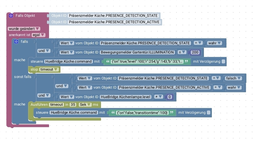 ich nutze Hue-Lampen mit den Hue-Bewegungsmeldern, um im Flur das Licht automatisch ein- und auszuschalten. Allerdings möchte ich die Logik dahinter in ioBroker nachbilden, so dass die Bewegungsmelder nur noch ein "Bewegung erkannt"-Signal liefern und dann das Schalten der Lampen über ein Skript läuft. So weit so gut.