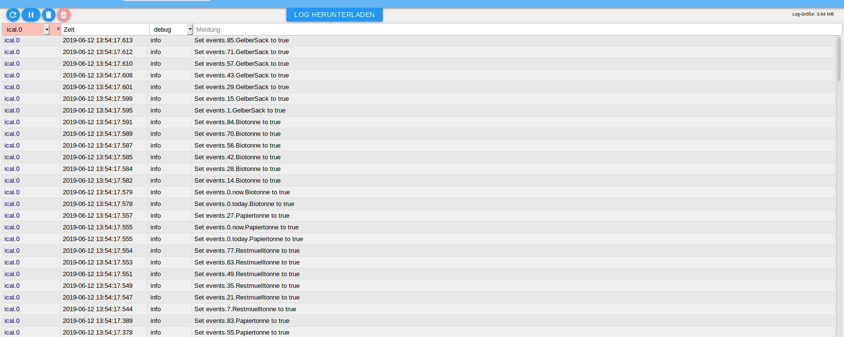habe seit paar Tagen ical am laufen für meine MüllTermine. Scripts habe ich alles mal Deaktiviert. Ical Objekteordnerr gelöscht. Adapter neu gestartet ..