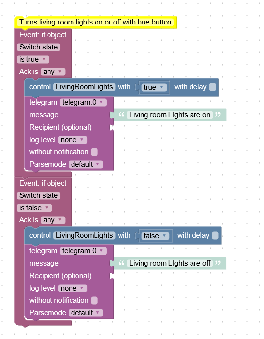 Hier auch mal das Resultat vom script beim einschalten:18:54:52.984 info javascript.0 script.js.LivingRoom.Living_room_lights_with_Hue_Switch: getState(id=zigbee.0.0017880104e6a64d.state, timerId=undefined) => {"val":true,"ack":true,"ts":1561222492980,"q":0,"from":"system.adapter.zigbee.0","user":"system.user.admin","lc":1561222492980} 18:54:52.984 info javascript.0 script.js.LivingRoom.Living_room_lights_with_Hue_Switch: getState(id=zigbee.0.7cb03eaa00b21fe3.state, timerId=undefined) => {"val":true,"ack":true,"ts":1561222242386,"q":0,"from":"system.adapter.zigbee.0","user":"system.user.admin","lc":1561222241880} 18:54:52.984 info javascript.0 script.js.LivingRoom.Living_room_lights_with_Hue_Switch: sendTo(adapter=telegram.0, cmd=send, msg={"text":"Living room LIghts are on"})