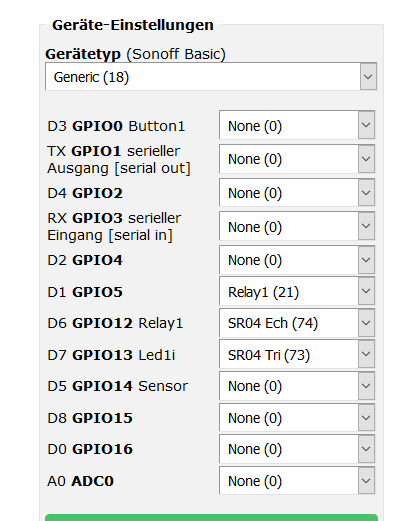 Die Widerstände kommen dann von VCC an jeweils einen GPIO + daran dann die vier Schaltkontakte der Sonde. An einen weiteren GPIO dann das Relais-Modul. Dann Tasmota/ESPEasy/ESPurna auf den ESP flashen und die 4 GPIOs als Schalter definieren, den letzten GPIO, wer hätte es gedacht, als Relais definieren :)