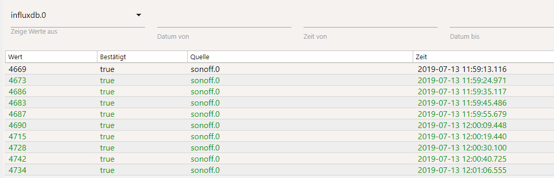 Beim Loggen ist mir nun aufgefallen, dass ein mit influxdb und history geloggter Datenpunkt nicht parallel geloggt wird, In der Tabelle ist immer ein Log-Unterschied von etwa 8 Minuten, die influxdb nach hängt. Kann mir jemand sagen, warum das so ist?