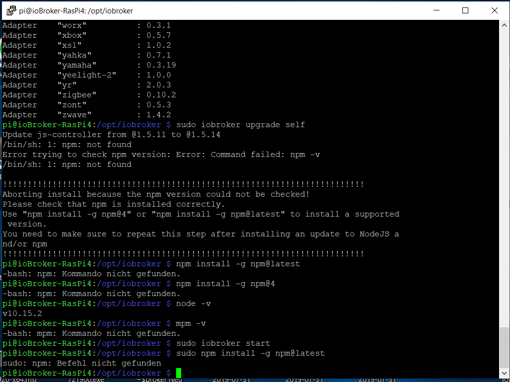 Was ist denn da passiert?Gemäß Usernamen "pi@iobroker-raspi4" ist es das genannte Image, da ist aber node 10.16 und npm 6.x drauf