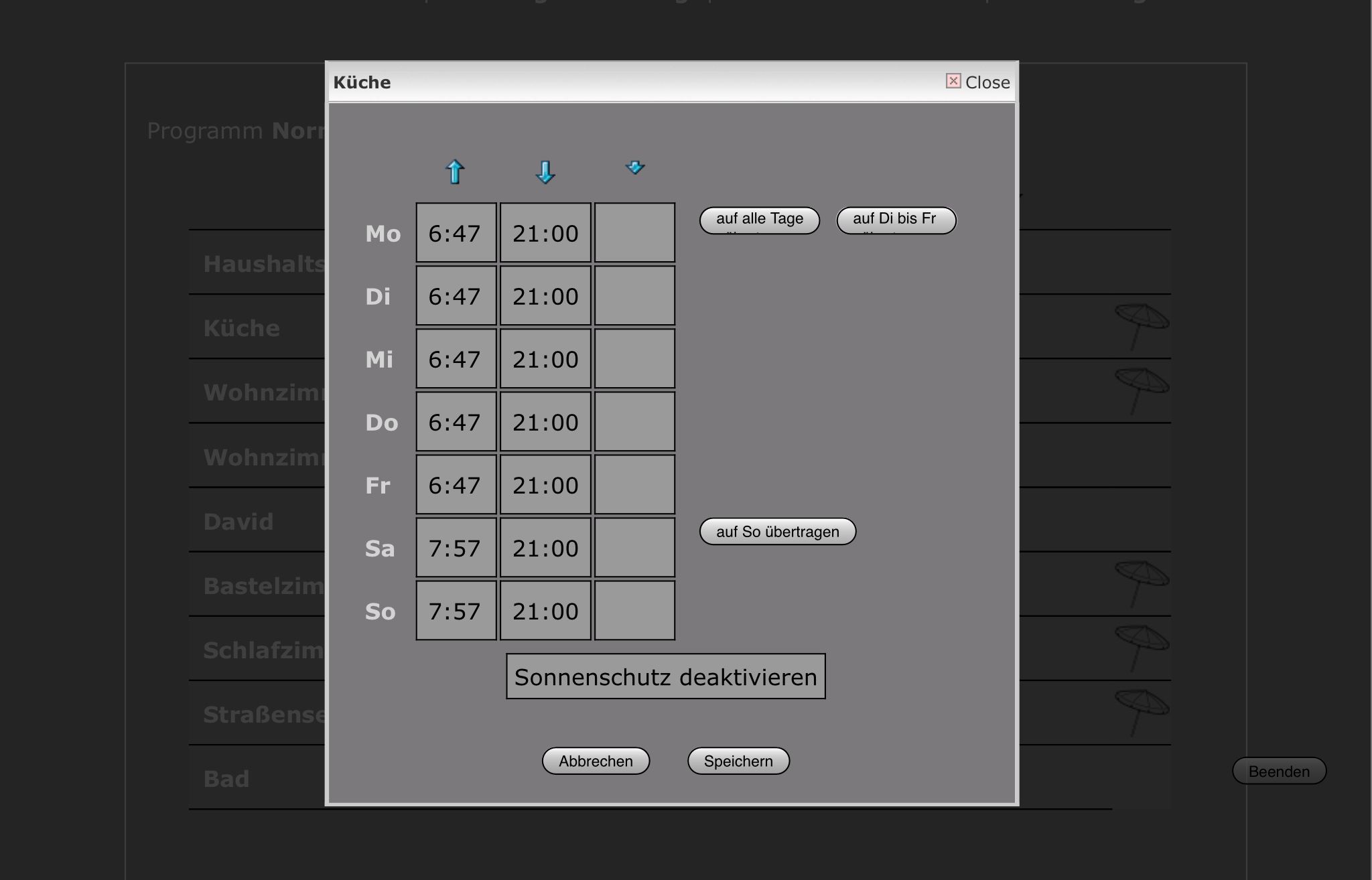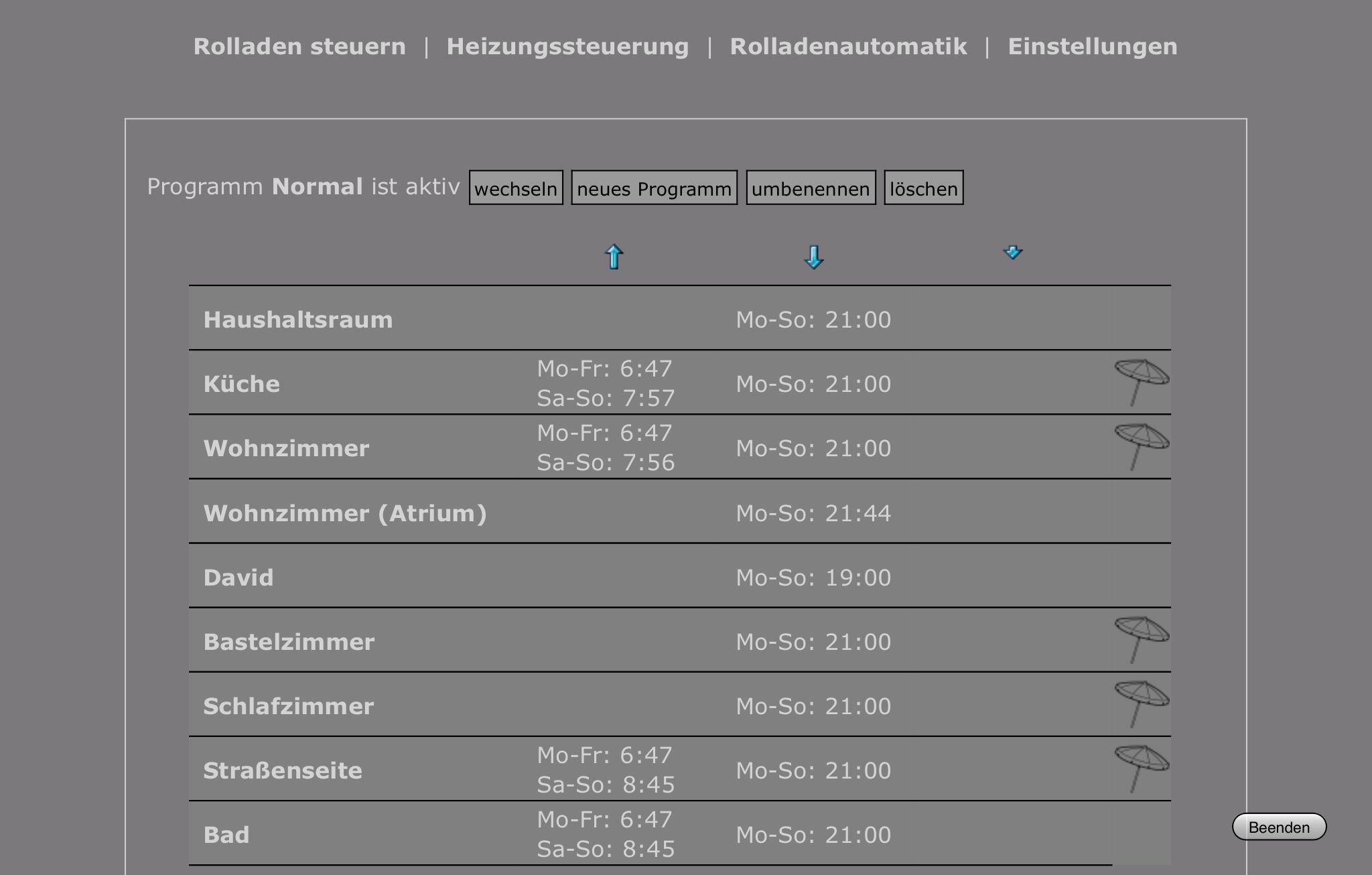 Dies gilt auch für die Rolladensteuerung, d.h. Anzeige der Zeiten aber auch eine einfache (!) Änderung. (siehe Screenshots).