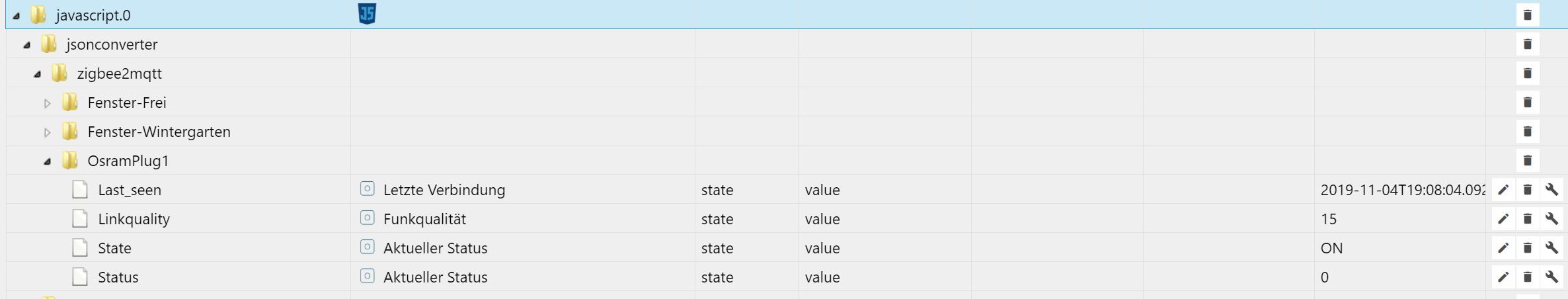 ich habe ein (Verständnis-)Problem mit MQTT und JSON. Nutze zigbee2mqtt und einige Osram Steckdosen. Über ein JSON Convert Script bekomme ich per MQTT sauber die Datenpunkte einzeln getrennt in IoBroker.