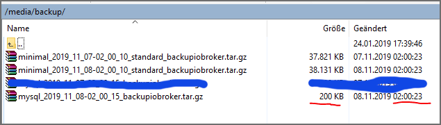hier noch die Liste der Backups (hier kann man sehen, wann das Backup für mysql die falsche Größe hatte)