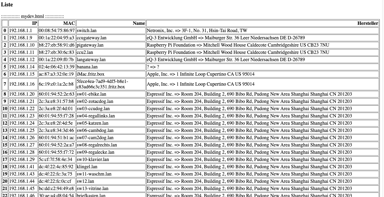 from getmac import get_mac_address import csv import socket import pandas as pd import threading import datetime import os import requests akt = datetime.datetime.now() def get_vendor(mac): sst = mac[0:8] name = names.get(sst) if name is None: return "? => ?" return name def pushOver(txt): title = "Geraet ! " message = "Neues Geraet im Haus \n" + txt + "\n" + akt.strftime("%Y-%m-%d %H:%M:%S") + " !" r = requests.post("https://api.pushover.net/1/messages.json", data={ "token": "--token--", "user": "--user--", "title": title, "message": message, "priority": 1 }) names = {} with open('oui.csv') as csv_file: csv_reader = csv.reader(csv_file, delimiter=',') for ar in csv_reader: search = ar[1][0:2] + ":" + ar[1][2:4] + ":" + ar[1][4:6] search = search.lower() names[search] = ar[2] + " => " + ar[3] aktip = {} macetc = {} allmac = {} with open('my.csv') as csv_file: csv_reader = csv.reader(csv_file, delimiter=',') for ar in csv_reader: aktip[ar[0]] = ar[1] macetc[ar[1]] = ar with open('mymac.csv') as csv_file: csv_reader = csv.reader(csv_file, delimiter=',') for ar in csv_reader: allmac[ar[0]] = ar class ip_check(threading.Thread): def __init__(self, ip): threading.Thread.__init__(self) self.ip = ip self.__name = "" self.__company = "" self.__mac = "" self.__newdev = True self.__newip = True self.__newmac = True self.__newipmac = True def run(self): self.__mac = get_mac_address(ip=self.ip) if (self.__mac is not None) and (self.__mac != "00:00:00:00:00:00"): self.__company = get_vendor(self.__mac) try: self.__name = socket.gethostbyaddr(self.ip)[0] except: self.__name = "?.local" smac = aktip.get(self.ip) if smac is not None: self.__newdev = False self.__newip = False if smac == self.__mac: self.__newipmac = False line = allmac.get(self.__mac) if line is not None: self.__newmac = False if line[3] == self.ip: self.__newipmac = False self.__newip = False def status(self): if self.found(): return "" + self.ip + " " + self.__mac + " " + self.__name + " " + self.__company else: return "?" def getLanList(self): if self.found(): txt = self.ip + " " + self.__name txt = txt + " " + self.__name.split(".")[0] return txt else: return "" def devStat(self): stat = "old mac+ip"; if self.__newdev: stat = "new " if self.__newmac: stat = "new mac " if self.__newip: stat = "new mac+ip" else: if self.__newip: stat = "new ip" return stat def devOk(self): return self.devStat() == "old mac+ip" def doPush(self): if self.devStat() == "new mac ": return True if self.devStat() == "new mac+ip": return True return False def getmac(self): return self.__mac def getcsv(self): if self.found(): return [self.ip, self.__mac, self.__name, self.__company] else: return [] def getAllMac(self): if self.found(): return [self.__mac, self.__name, self.__company, self.ip] else: return [] def found(self): if (self.__mac is None) or (self.__mac == "00:00:00:00:00:00"): return False else: return True check_results = [] for i in range(1, 255): ip = "192.168.1." + str(i) ipp = "192.168.1." + ("000" + str(i))[-3:] current = ip_check(ip) check_results.append(current) current.start() with open('my.csv', 'w') as csv_file: csv_writer = csv.writer(csv_file, delimiter=',', quoting=csv.QUOTE_ALL) for el in check_results: el.join() if el.found(): allmac[el.getmac()] = el.getAllMac() try: macetc.pop(el.getmac()) except Exception as e: sub = 0 if el.devOk() == False: print(akt.strftime("%Y-%m-%d %H:%M:%S") + ":" + el.devStat() + " " + el.status()) if el.doPush() == True: pushOver(el.status()) csv_writer.writerow(el.getcsv()) # print(el.getLanList()) for el in macetc: if el is not None: val = macetc.get(el) print(akt.strftime("%Y-%m-%d %H:%M:%S") + ":DEL " + " ".join(val) + "<br>") if os.path.exists("mymac.csv"): os.remove("mymac.csv") with open('mymac.csv', 'w') as csv_file: csv_writer = csv.writer(csv_file, delimiter=',', quoting=csv.QUOTE_ALL) for ar in allmac: val = allmac.get(ar) csv_writer.writerow(val) # ende = datetime.datetime.now() # print("Start: " + akt.strftime("%Y-%m-%d %H:%M:%S") + " Dauer:" + str(ende - akt)) df = pd.read_csv('my.csv', names=['IP', 'MAC', 'Name', 'Hersteller']) # Save to file df.to_html('mydev.html')Hier die DB für MAC->Hersteller: