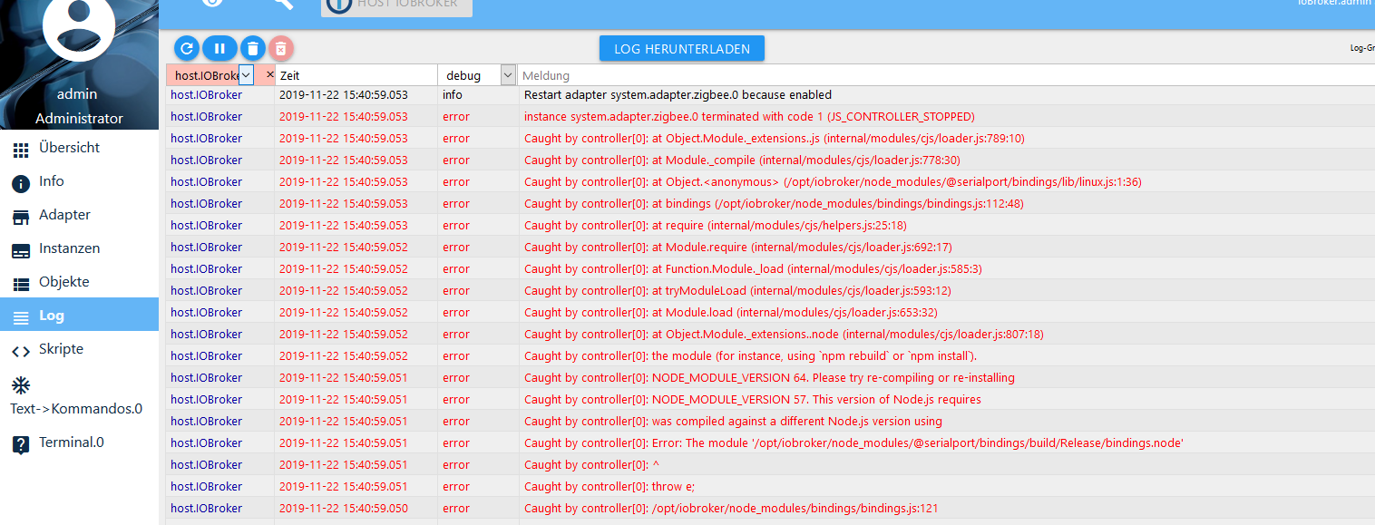 Ich habe heute den JS Controller (2.1) und Node JS (v10.17.0) aktuallisiert jetzt habe ich ein Problem mit Zigbee und BLE Adapter. NPM rebuild und Fixer hab ich laufen gelassen hat aber nix gebracht.