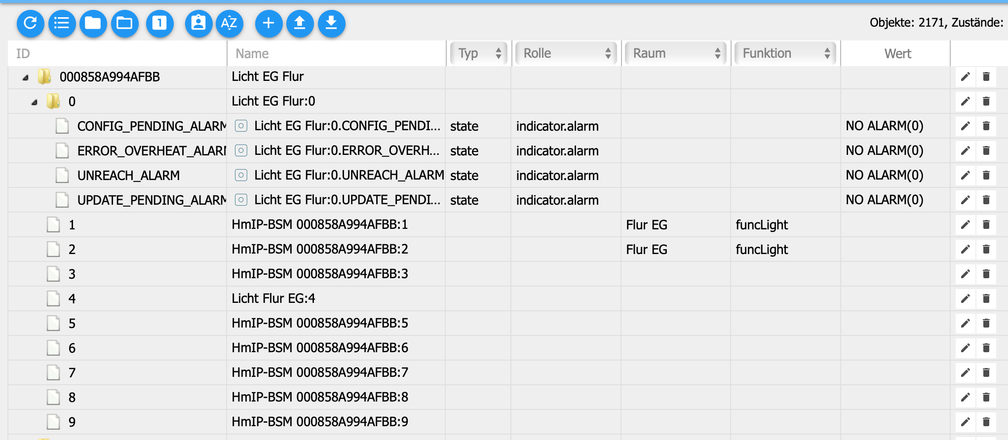 Schaue ich jetzt in meine Objekte, dann sehe ich, dass die Geräte bzw die Gerätekanäle nur unvollständig geladen wurden: