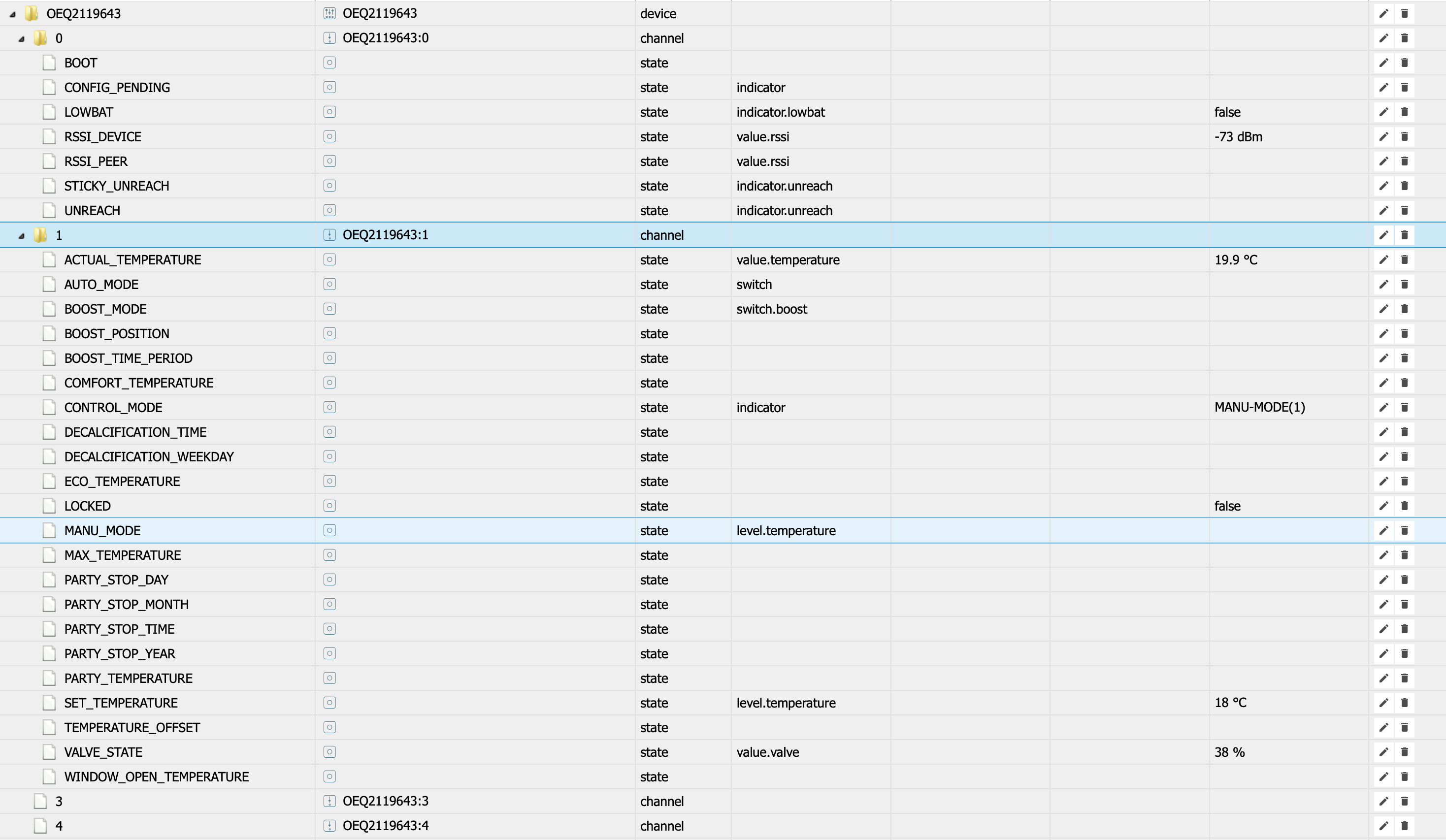 Die wichtigsten Werte, wie aktuell gesetzte Temperatur, gemessene Temperatur, Steuerungsmodus, etc., kommen ja auch an.Wollte nur wissen, ob es normal ist, dass man erst Werte bekommt, nachdem man einen Wert geschrieben hat, und ob es normal ist, dass man nicht für alle Objekte Werte bekommt und nicht alle Objekte eine Rolle zugewiesen haben.