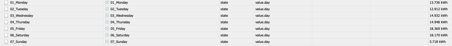 Ich glaube mein Problem wird gerade Stück für Stück gelöst. Ich hatte zunächst im History Setting "30" für den Wert "trotzdem gleiche Werte aufzeichnen" eingetragen. Das hat zur Folge, dass alle Wochentage zwar die richtige kWh Zahl aufwiesen, aber halt alle mit dem heutigen Datum.