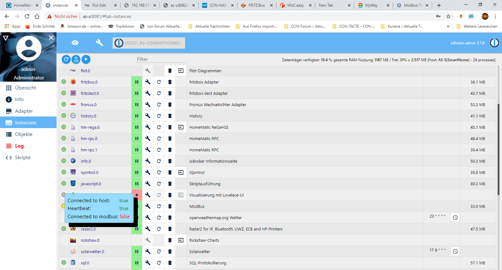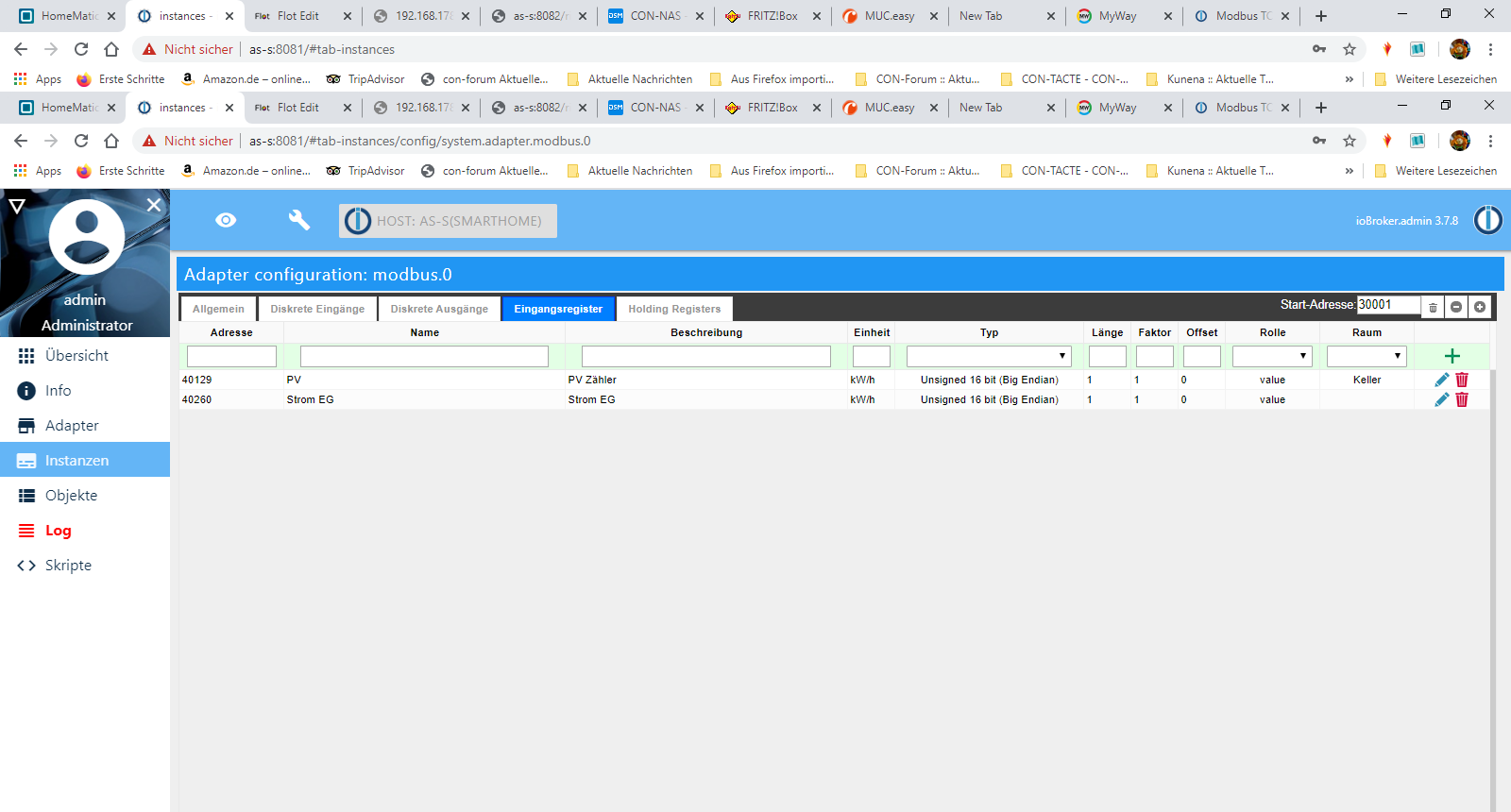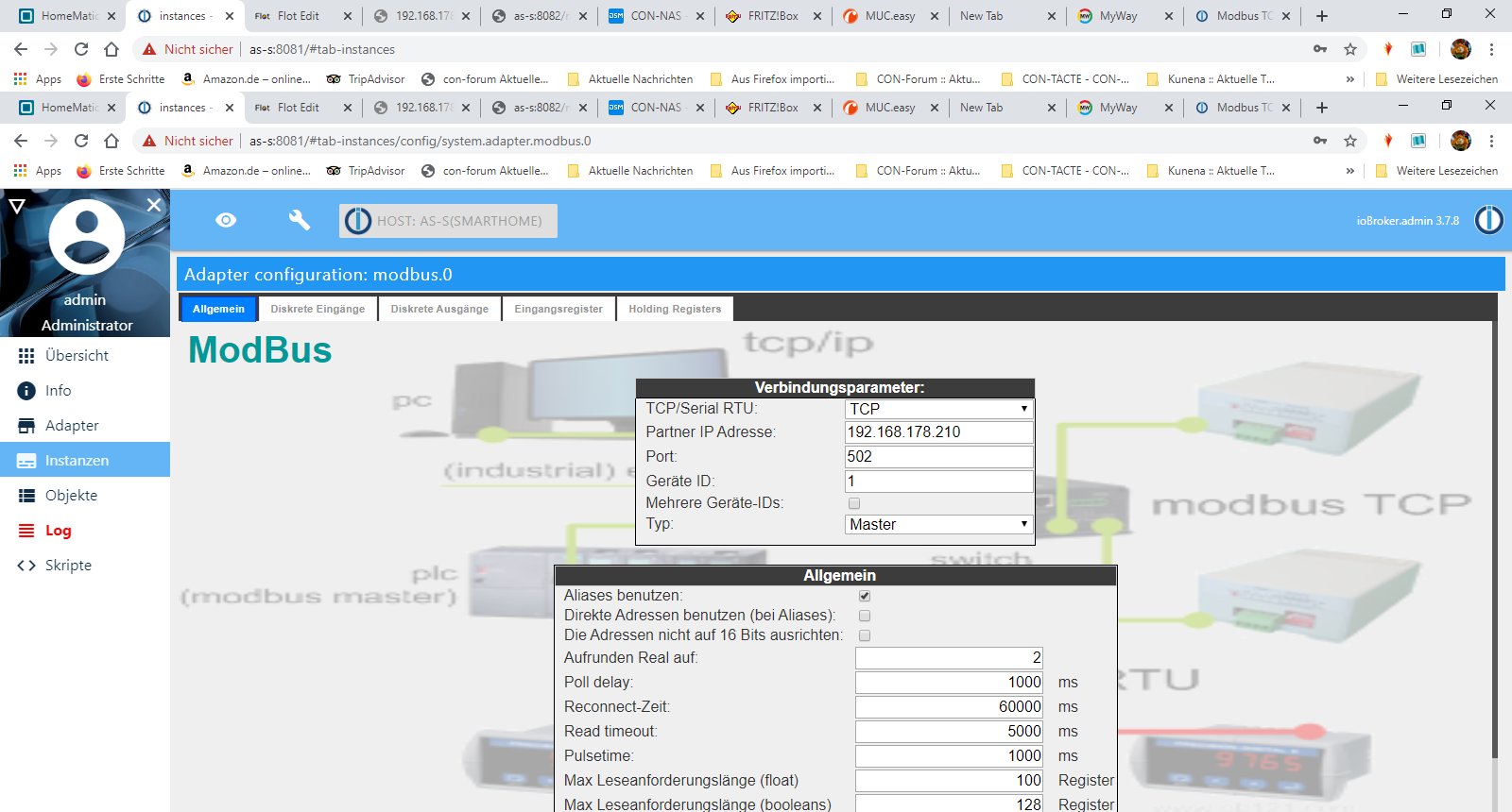 Ich HATTE den Modbus schonmal funktionell aktiviert, ABER ich hatte die IO-Broker Daten bei der Neuinstallation nicht gesichert. Auch den Kollegen, der mit damals geholfen hatte, erreiche ich nicht mehr.Meine Hardware:
