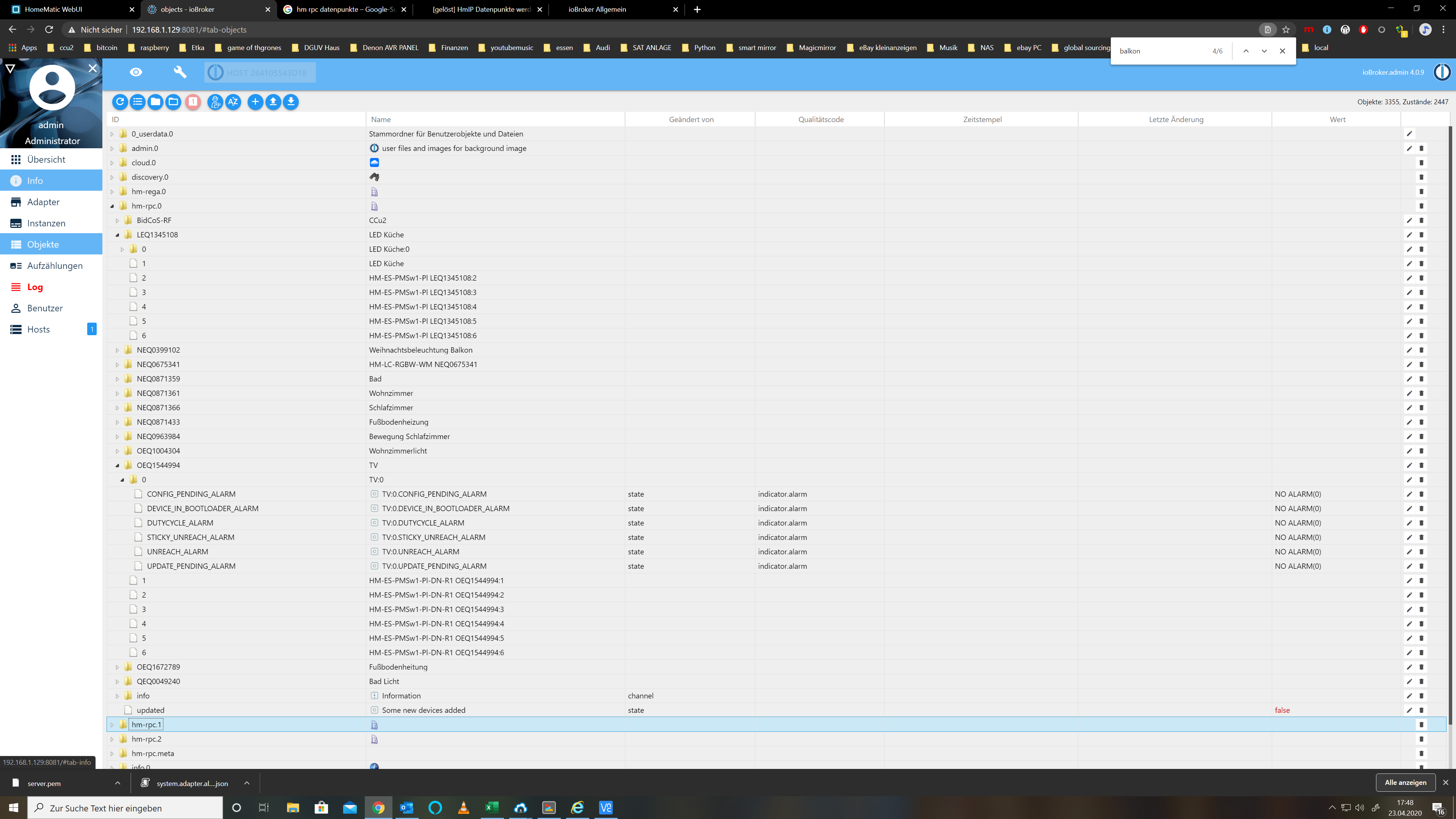 hm-rega.0 wurde vor dem log pausiert.hm-rega.0 2020-04-23 22:17:03.204 debug (1172) <-- {"2918":{"Name":"Absenktemperatur%2017.0%20C","TypeName":"PROGRAM","PrgInfo":"", "Active":true,"Timestamp":"2020-04-23 17:27:28"}, "15551":{"Name":"Absenktemperatur%20T%FCr%20Balkon%20AUF" hm-rega.0 2020-04-23 22:17:03.165 debug (1172) --> !# programs.fn 1.3 !# Dieses Script gibt eine Liste der Programme als JSON Strin hm-rega.0 2020-04-23 22:17:03.094 debug (1172) <-- {"19131":[false,"2020-04-23 22:04:01"], "40":[0,"2020-04-23 17:27:17"], "1233":[false,"1970-01-01 01:00:00"], "950":[true,"2020-04-23 17:27:21"], "19269":[true,"2020-04-23 17:27:13"], hm-rega.0 2020-04-23 22:17:03.042 debug (1172) 2 pending requests hm-rega.0 2020-04-23 22:17:03.024 debug (1172) --> !# pollingInv.fn 0.1 !# !# Dieses Script gibt die Systemvariablen (inklusive uns hm-rega.0 2020-04-23 22:17:03.013 debug (1172) --> programs.fn hm-rega.0 2020-04-23 22:17:03.009 debug (1172) --> pollingInv.fn hm-rega.0 2020-04-23 22:16:33.190 debug (1172) <-- {"2918":{"Name":"Absenktemperatur%2017.0%20C","TypeName":"PROGRAM","PrgInfo":"", "Active":true,"Timestamp":"2020-04-23 17:27:28"}, "15551":{"Name":"Absenktemperatur%20T%FCr%20Balkon%20AUF" hm-rega.0 2020-04-23 22:16:33.151 debug (1172) --> !# programs.fn 1.3 !# Dieses Script gibt eine Liste der Programme als JSON Strin hm-rega.0 2020-04-23 22:16:33.084 debug (1172) <-- {"19131":[false,"2020-04-23 22:04:01"], "40":[0,"2020-04-23 17:27:17"], "1233":[false,"1970-01-01 01:00:00"], "950":[true,"2020-04-23 17:27:21"], "19269":[true,"2020-04-23 17:27:13"], hm-rega.0 2020-04-23 22:16:33.072 debug (1172) 2 pending requests hm-rega.0 2020-04-23 22:16:33.030 debug (1172) --> !# pollingInv.fn 0.1 !# !# Dieses Script gibt die Systemvariablen (inklusive uns hm-rega.0 2020-04-23 22:16:33.013 debug (1172) --> programs.fn hm-rega.0 2020-04-23 22:16:33.010 debug (1172) --> pollingInv.fn hm-rega.0 2020-04-23 22:16:04.806 debug (1172) <-- {"1914":{"Name":"AL-CUX2801001%3A0.LOWBAT","AlState":0,"AlOccurrenceTime":"1970-01-01 01:00:00","LastTriggerTime":"1970-01-01 01:00:00","Operations":5,"AlTriggerDP":1913,"Parent":1912}, "1 hm-rega.0 2020-04-23 22:16:04.482 debug (1172) --> !# alarms.fn !# !# Dieses Homematic-Script gibt eine Liste aller Alarm-Datenpunk hm-rega.0 2020-04-23 22:16:04.019 debug (1172) --> alarms.fn hm-rega.0 2020-04-23 22:16:04.019 debug (1172) create service messages hm-rega.0 2020-04-23 22:16:04.017 info (1172) got state values hm-rega.0 2020-04-23 22:16:03.670 debug (1172) <-- {"BidCos-RF.NEQ0871359%3A0.UNREACH":false, "BidCos-RF.NEQ0871359%3A0.STICKY_UNREACH":false, "BidCos-RF.NEQ0871359%3A0.CONFIG_PENDING":false, "BidCos-RF.NEQ0871359%3A0.LOWBAT":false, "Bi hm-rega.0 2020-04-23 22:16:03.141 debug (1172) --> !# datapoints.fn 1.8 !# !# Dieses Homematic-Script gibt eine Liste aller Datenpu hm-rega.0 2020-04-23 22:16:03.009 debug (1172) --> datapoints.fn hm-rega.0 2020-04-23 22:16:03.008 info (1172) request state values hm-rega.0 2020-04-23 22:16:03.007 info (1172) deleted 0 variables hm-rega.0 2020-04-23 22:16:03.006 info (1172) added/updated 31 variables hm-rega.0 2020-04-23 22:16:02.969 debug (1172) <-- {"40":{"Name":"Alarmmeldungen","TypeName":"VARDP","DPInfo":"Anzahl%20Alarmmeldungen","Value":0,"ValueMin":0,"ValueMax":65000,"ValueUnit":"","ValueType":16,"ValueSubType":0,"ValueList":""}, hm-rega.0 2020-04-23 22:16:02.895 debug (1172) --> !# variablesInv.fn 0.1 !# !# Dieses Script gibt die Systemvariablen (inklusive u hm-rega.0 2020-04-23 22:16:02.806 debug (1172) --> variablesInv.fn hm-rega.0 2020-04-23 22:16:02.805 info (1172) got 31 variables hm-rega.0 2020-04-23 22:16:02.501 info (1172) deleted 0 programs hm-rega.0 2020-04-23 22:16:02.500 info (1172) added/updated 45 programs hm-rega.0 2020-04-23 22:16:02.401 debug (1172) <-- {"2918":{"Name":"Absenktemperatur%2017.0%20C","TypeName":"PROGRAM","PrgInfo":"", "Active":true,"Timestamp":"2020-04-23 17:27:28"}, "15551":{"Name":"Absenktemperatur%20T%FCr%20Balkon%20AUF" hm-rega.0 2020-04-23 22:16:02.362 debug (1172) --> !# programs.fn 1.3 !# Dieses Script gibt eine Liste der Programme als JSON Strin hm-rega.0 2020-04-23 22:16:02.351 debug (1172) --> programs.fn hm-rega.0 2020-04-23 22:16:02.350 info (1172) got 45 programs hm-rega.0 2020-04-23 22:16:02.328 info (1172) renamed hm-rpc.0.NEQ0871359 to "Bad" hm-rega.0 2020-04-23 22:16:02.322 info (1172) renamed hm-rpc.0.NEQ0871359.0 to "Bad:0" hm-rega.0 2020-04-23 22:16:02.316 info (1172) renamed hm-rpc.0.NEQ0871359.1 to "Heizung Bad:1" hm-rega.0 2020-04-23 22:16:02.310 info (1172) renamed hm-rpc.0.NEQ0871359.2 to "Heizung Bad:2" hm-rega.0 2020-04-23 22:16:02.305 info (1172) renamed hm-rpc.0.NEQ0871359.3 to "HM-CC-RT-DN NEQ0871359:3" hm-rega.0 2020-04-23 22:16:02.299 info (1172) renamed hm-rpc.0.NEQ0871359.4 to "Heizung Bad:4" hm-rega.0 2020-04-23 22:16:02.293 info (1172) renamed hm-rpc.0.NEQ0871359.5 to "HM-CC-RT-DN NEQ0871359:5" hm-rega.0 2020-04-23 22:16:02.287 info (1172) renamed hm-rpc.0.NEQ0871359.6 to "HM-CC-RT-DN NEQ0871359:6" hm-rega.0 2020-04-23 22:16:02.281 info (1172) renamed hm-rpc.0.QEQ0049240 to "Bad Licht" hm-rega.0 2020-04-23 22:16:02.274 info (1172) renamed hm-rpc.0.QEQ0049240.0 to "Bad Licht:0" hm-rega.0 2020-04-23 22:16:02.266 info (1172) renamed hm-rpc.0.QEQ0049240.1 to "Bad Licht:1" hm-rega.0 2020-04-23 22:16:02.258 info (1172) renamed hm-rpc.0.NEQ0963984 to "Bewegung Schlafzimmer" hm-rega.0 2020-04-23 22:16:02.249 info (1172) renamed hm-rpc.0.NEQ0963984.0 to "Bewegung Schlafzimmer:0" hm-rega.0 2020-04-23 22:16:02.243 info (1172) renamed hm-rpc.0.NEQ0963984.1 to "HM-Sen-MDIR-WM55 NEQ0963984:1" hm-rega.0 2020-04-23 22:16:02.237 info (1172) renamed hm-rpc.0.NEQ0963984.2 to "HM-Sen-MDIR-WM55 NEQ0963984:2" hm-rega.0 2020-04-23 22:16:02.232 info (1172) renamed hm-rpc.0.NEQ0963984.3 to "HM-Sen-MDIR-WM55 NEQ0963984:3" hm-rega.0 2020-04-23 22:16:02.226 info (1172) renamed hm-rpc.2.00091A49A0824C to "Bewegungsmelder LUX" hm-rega.0 2020-04-23 22:16:02.219 info (1172) renamed hm-rpc.2.0