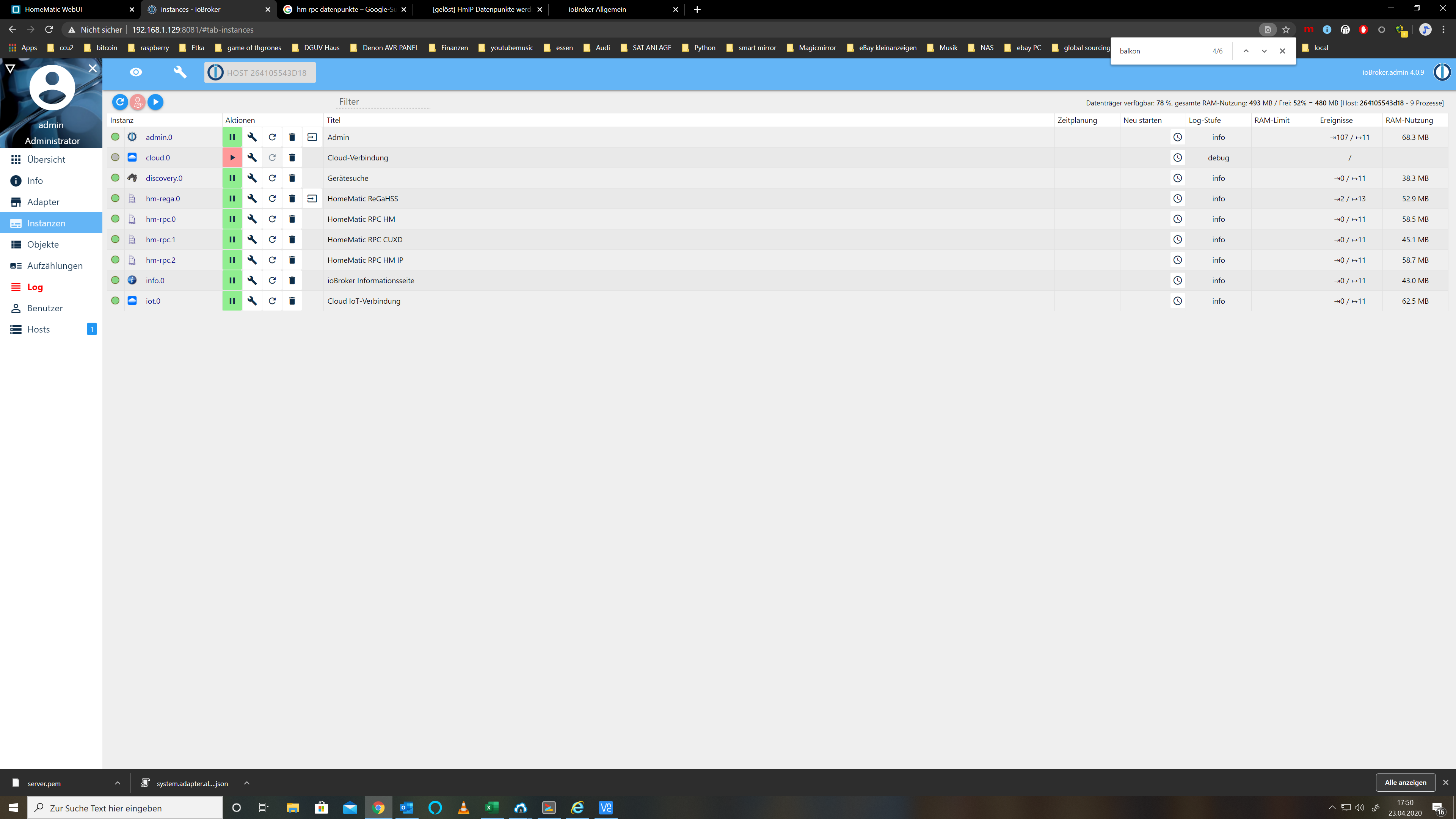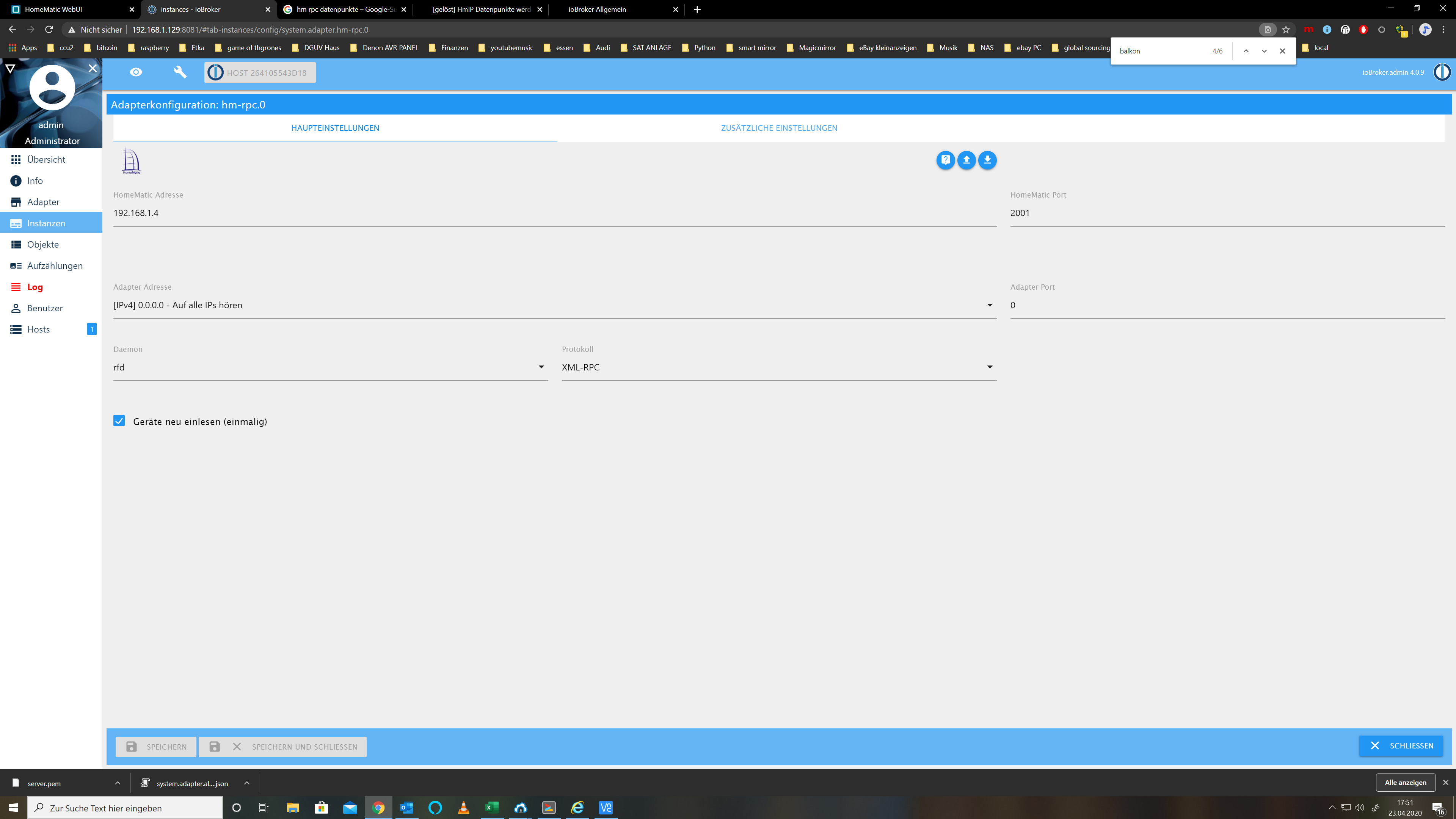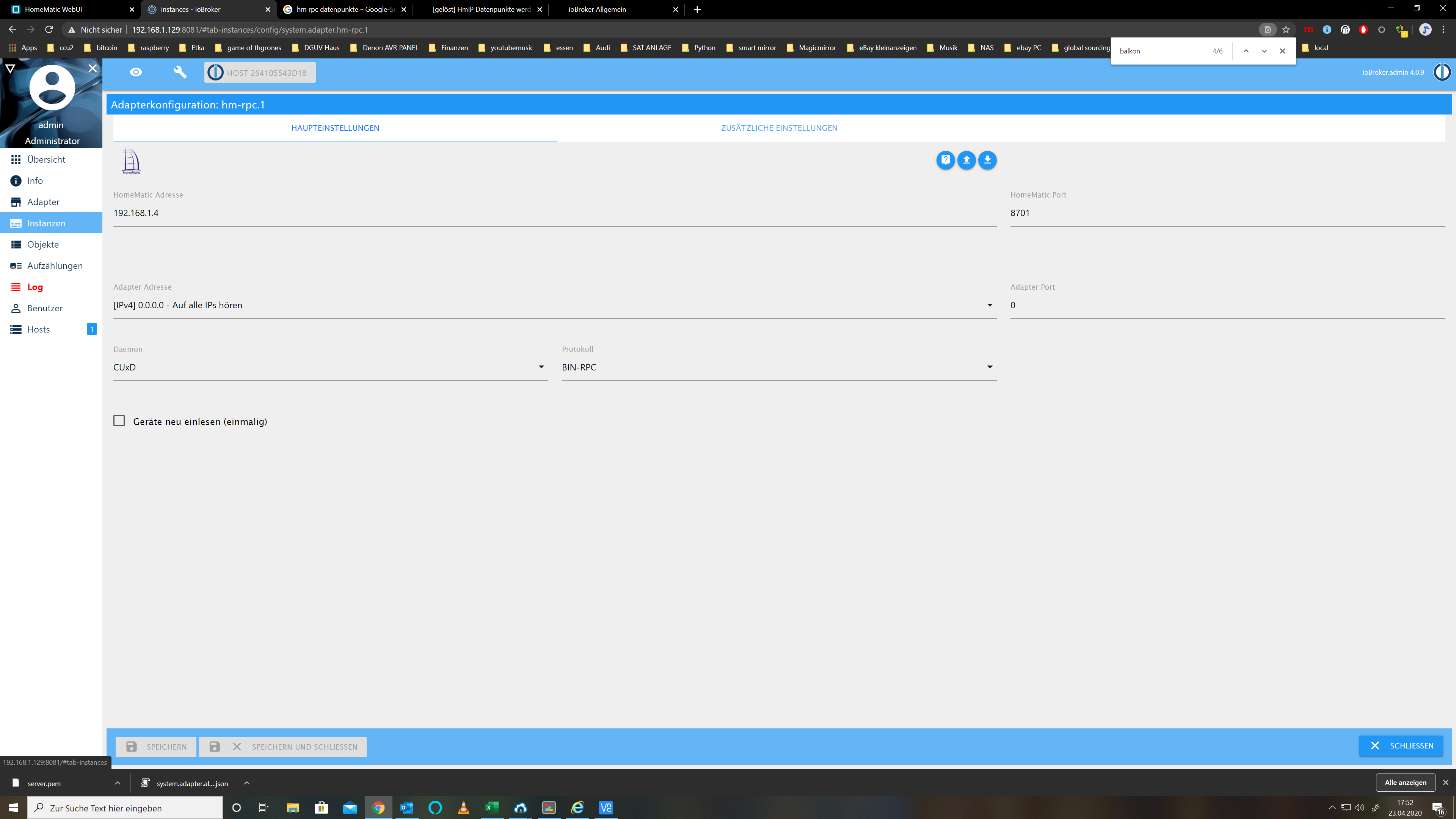 hm-rpc.1 2020-04-23 22:58:19.086 info (1479) Connected hm-rpc.1 2020-04-23 22:58:19.081 info (1479) new CUxD devices/channels after filter: 0 hm-rpc.1 2020-04-23 22:58:17.706 info (1479) binrpc -> listDevices 93 hm-rpc.1 2020-04-23 22:58:16.888 info (1479) binrpc client is trying to connect to 192.168.1.4:8701/ with ["xmlrpc_bin://192.168.1.129:8701","hm-rpc.1"] hm-rpc.1 2020-04-23 22:58:16.886 info (1479) binrpc server is trying to listen on 0.0.0.0:8701 hm-rpc.1 2020-04-23 22:58:15.283 info (1479) starting. Version 1.13.0 in /opt/iobroker/node_modules/iobroker.hm-rpc, node: v10.20.1hm-rpc.2: